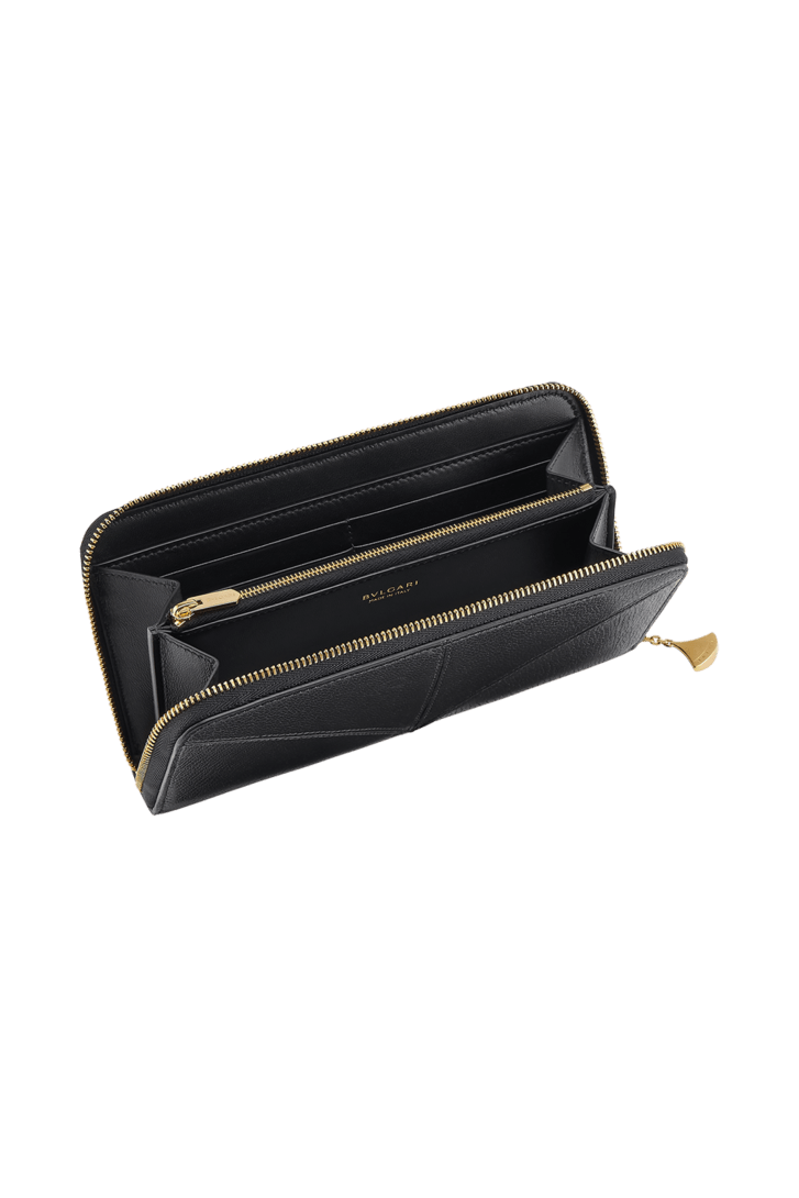 Confectionné en cuir de chèvre noir grainé et compact à l'extérieur et en cuir nappa noir à l'intérieur, le grand portefeuille Divas' Dream est orné de la signature esthétique en forme d’éventail de la collection, inspirée du style joaillier de Bvlgari et de son héritage culturel romain. Ce modèle élégant et raffiné est doté d'une fermeture zippée agrémentée d’un pendentif Divas' Dream métallique. Il possède également une poche de séparation intérieure zippée, deux compartiments à billets, deux poches plates et huit emplacements cartes de crédit. Dimensions : 19 × 10 × 2 cm. Fabriqué en Italie.