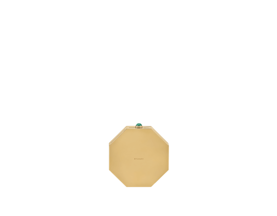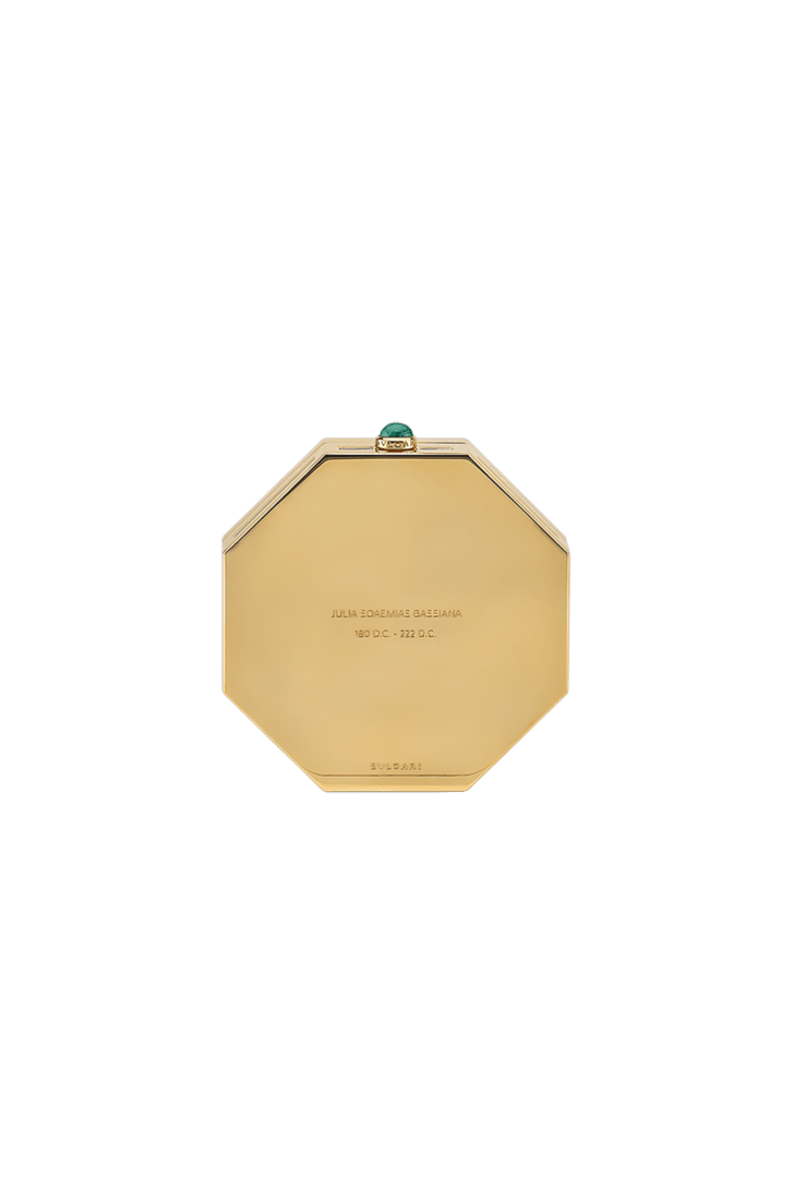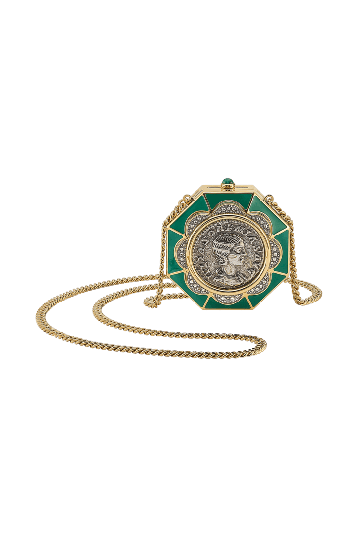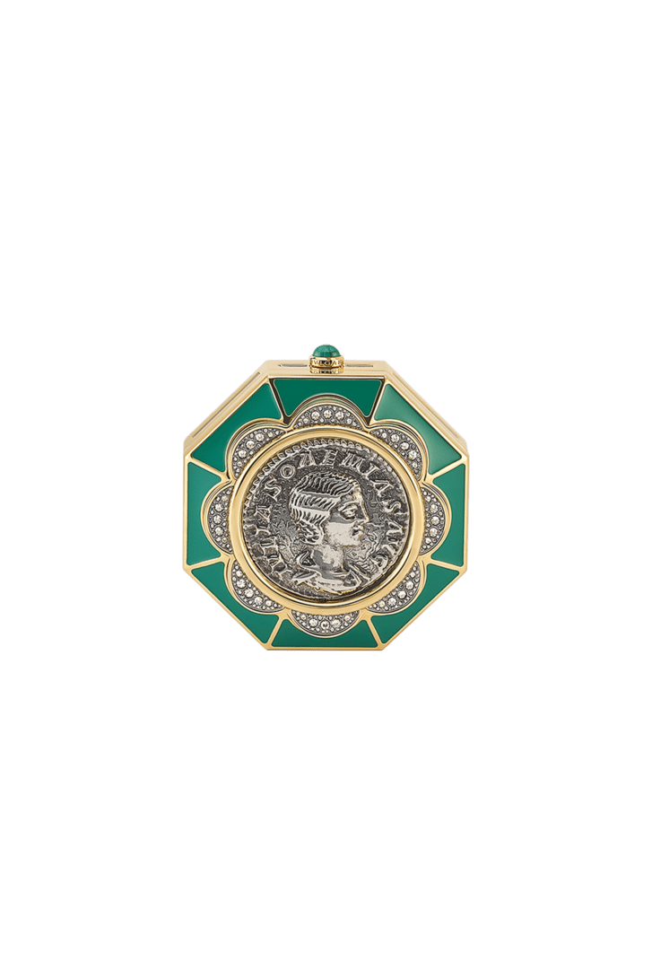 Minaudière Monete mini modèle en aluminium doré et laiton à finition antique, rehaussée d’un détail central inspiré d’une pièce de monnaie romaine et entouré d’émail vert et de zircones cristallines argentées ; fermoir à bouton-pression avec élément en malachite.