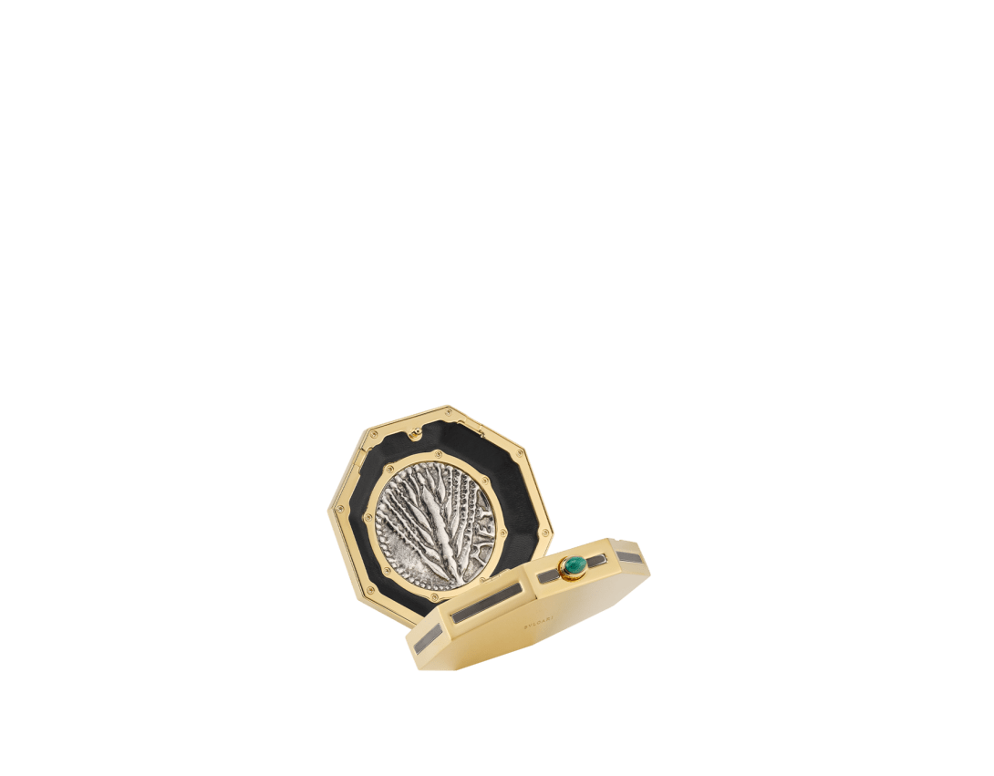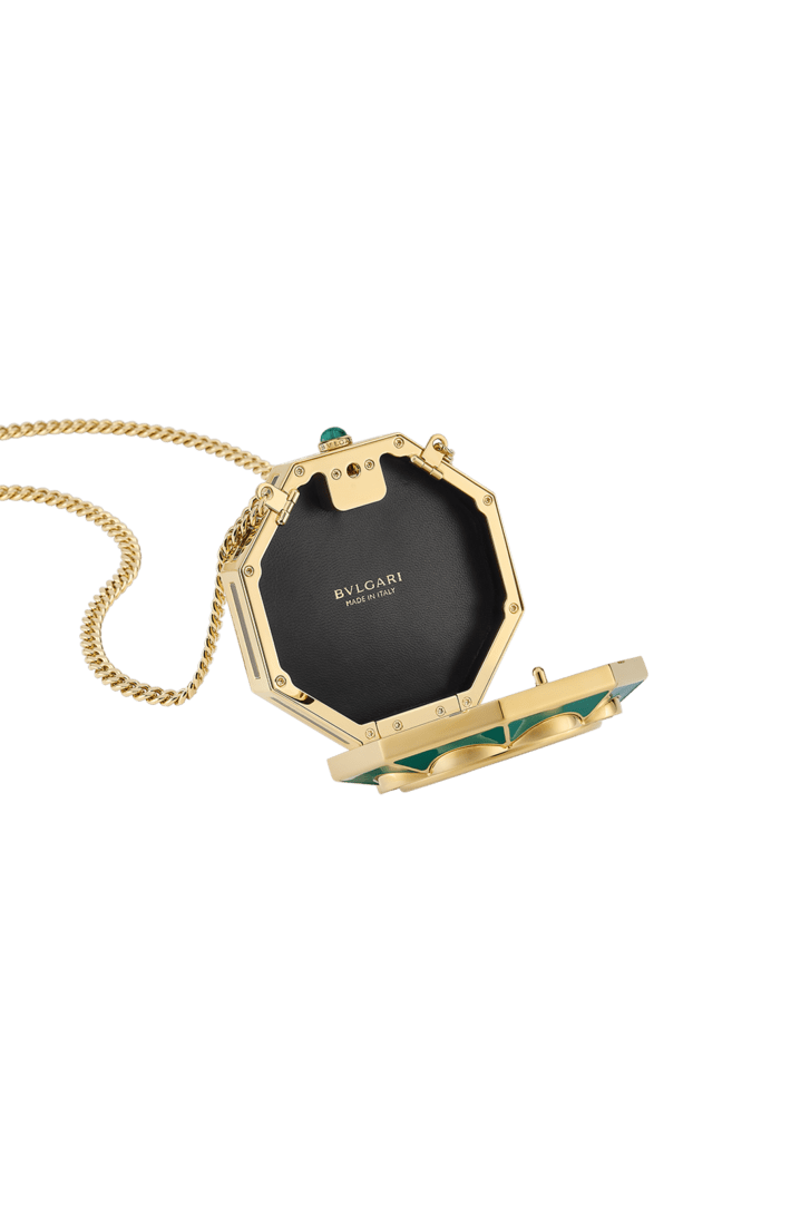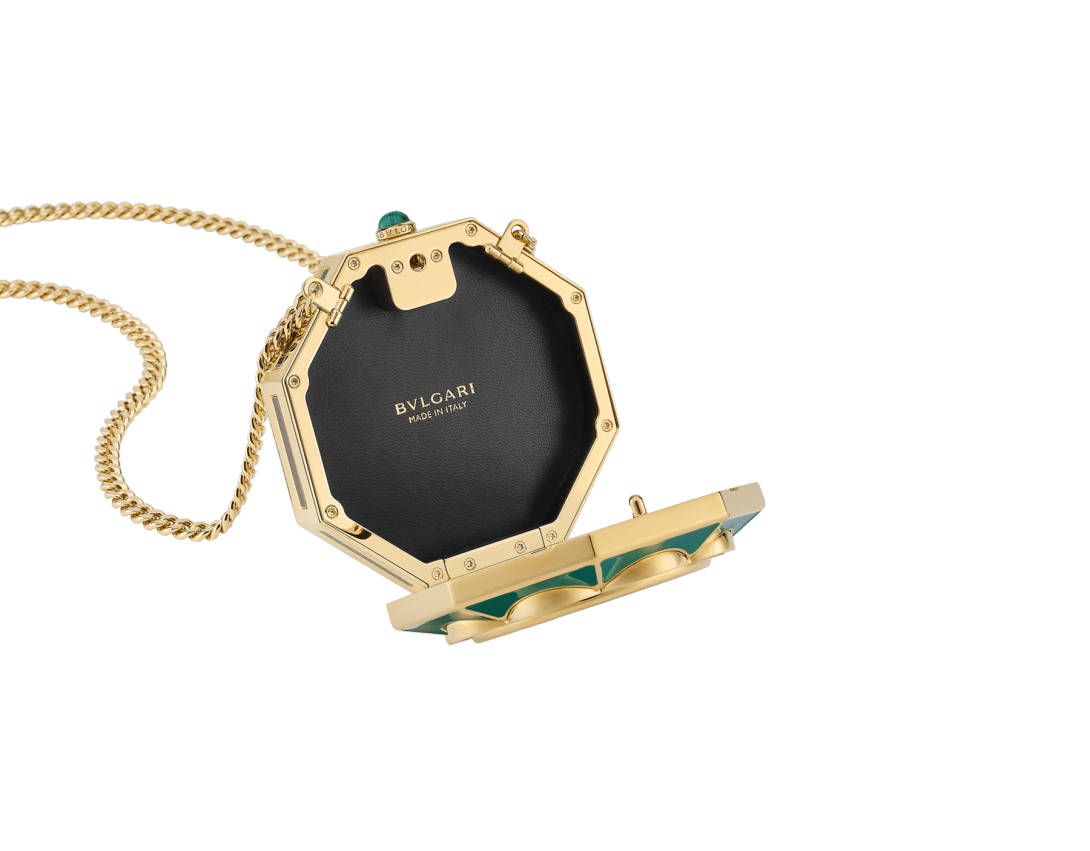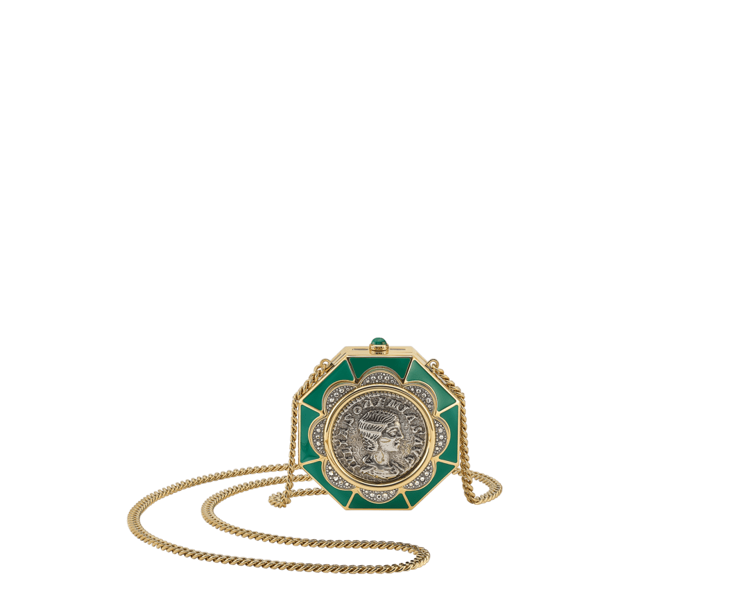 La collection Bvlgari Icons Minaudière en édition limitée réinterprète les symboles intemporels de Bvlgari, en créant une passerelle entre l’univers de la joaillerie et celui des accessoires avec des créations qui incarnent à la fois l’héritage et l’innovation. La minaudière Monete mini modèle présente une silhouette octogonale et sculpturale fabriquée à partir d’aluminium doré et de laiton à finition antique, mettant en valeur une reproduction d’une pièce romaine ancienne entourée d’émail vert appliqué à la main et de zircones cristallines argentées. Cette création est complétée par une chaîne et comprend un compartiment unique avec une doublure en cuir nappa noir et un fermoir à bouton-pression. Objet d’art raffiné, cette minaudière est accompagnée d’un livre miniature spécialement conçu par Isabella Rossellini, « Notes on Listening to Nature », parfaitement adapté à sa forme. Modèle fabriqué en Italie.