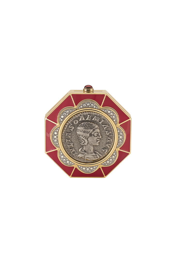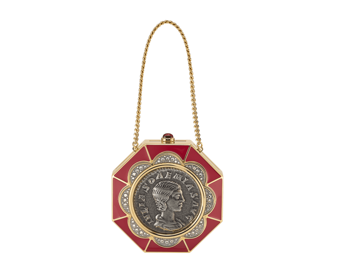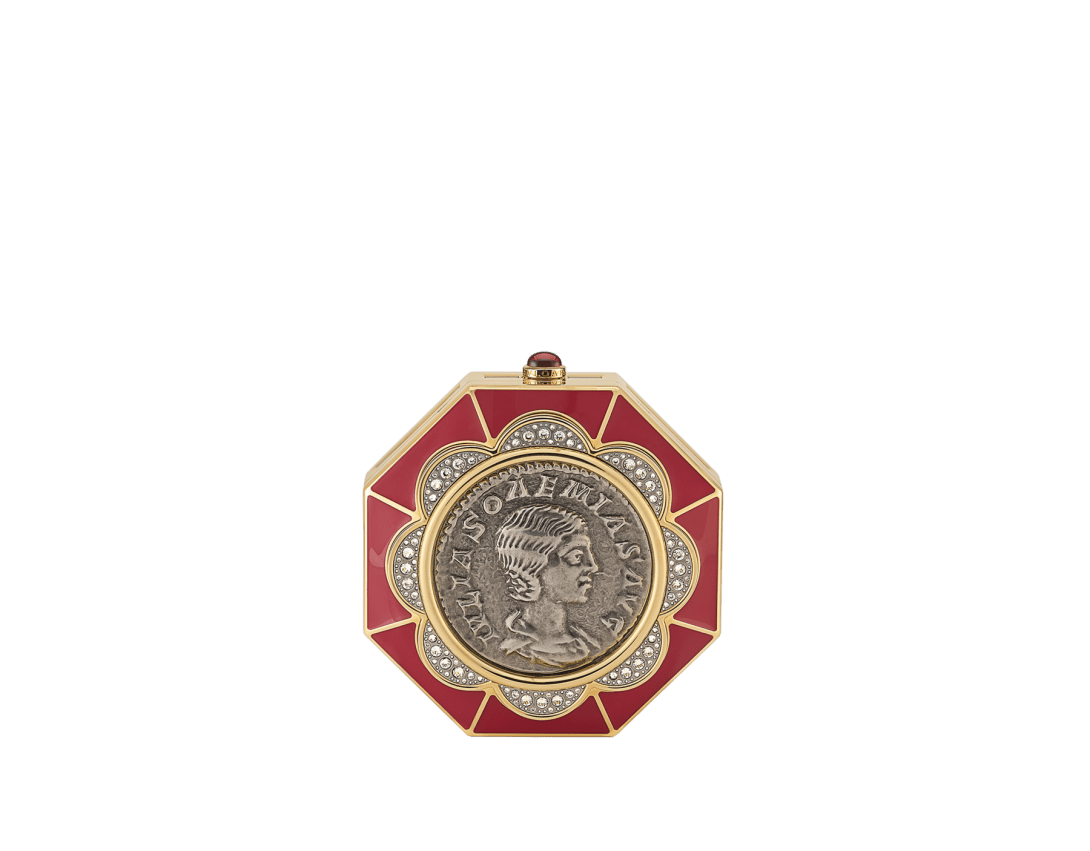 Minaudière Monete en aluminium doré et laiton à finition antique, rehaussée d’un détail central inspiré d’une pièce de monnaie romaine et entouré d’émail rouge et de zircones cristallines argentées ; fermoir à bouton-pression avec élément rouge en cristal.