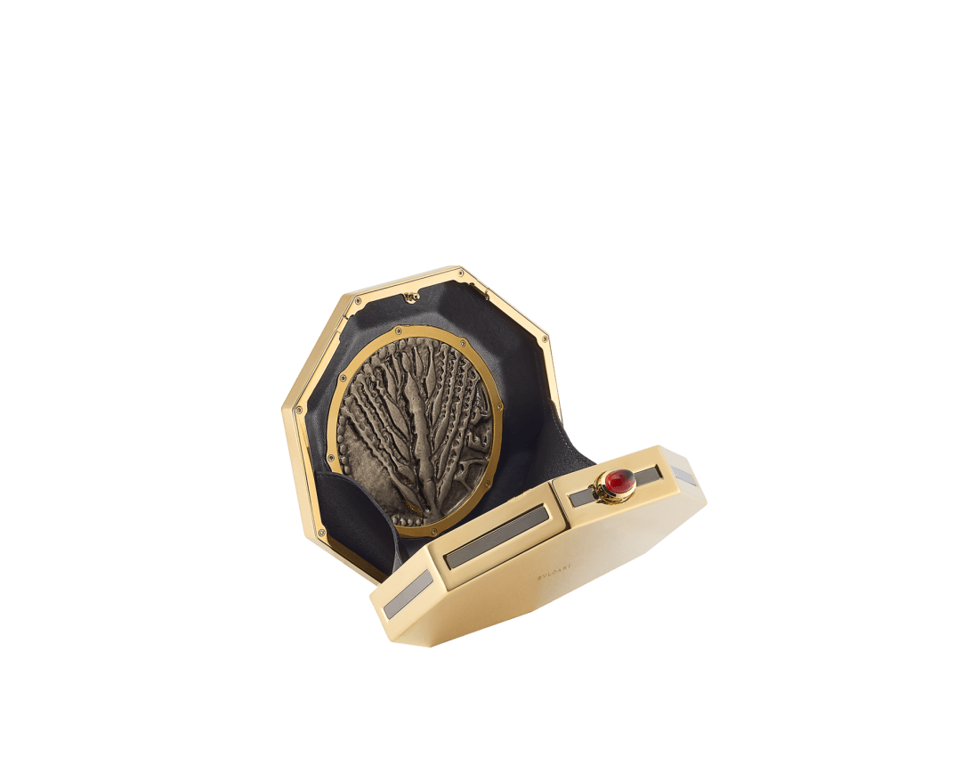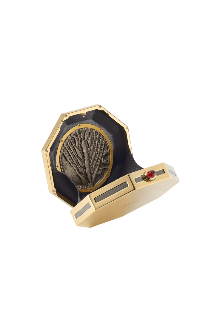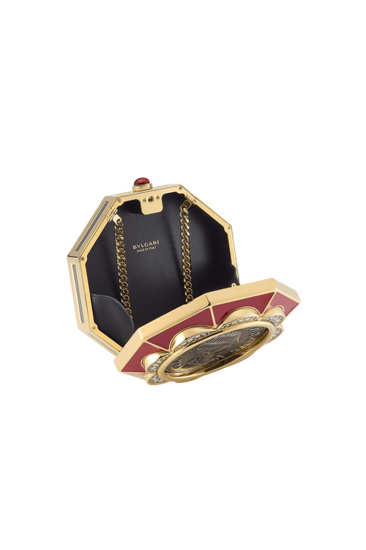 La collection Bvlgari Icons Minaudière en édition limitée réinterprète les symboles intemporels de Bvlgari, en créant une passerelle entre l’univers de la joaillerie et celui des accessoires avec des créations qui incarnent à la fois l’héritage et l’innovation. La minaudière Monete présente une silhouette octogonale et sculpturale fabriquée à partir d’aluminium doré et de laiton à finition antique, mettant en valeur une reproduction d’une pièce romaine ancienne entourée d’émail rouge appliqué à la main et de zircones cristallines argentées. Cette création est complétée par une chaîne qui permet de la porter à la main et comprend un compartiment unique avec une doublure en cuir nappa noir et un fermoir à bouton-pression. Objet d’art raffiné, cette minaudière est accompagnée d’un livre miniature spécialement conçu par Isabella Rossellini, « Notes on Listening to Nature », parfaitement adapté à sa forme. Modèle fabriqué en Italie.