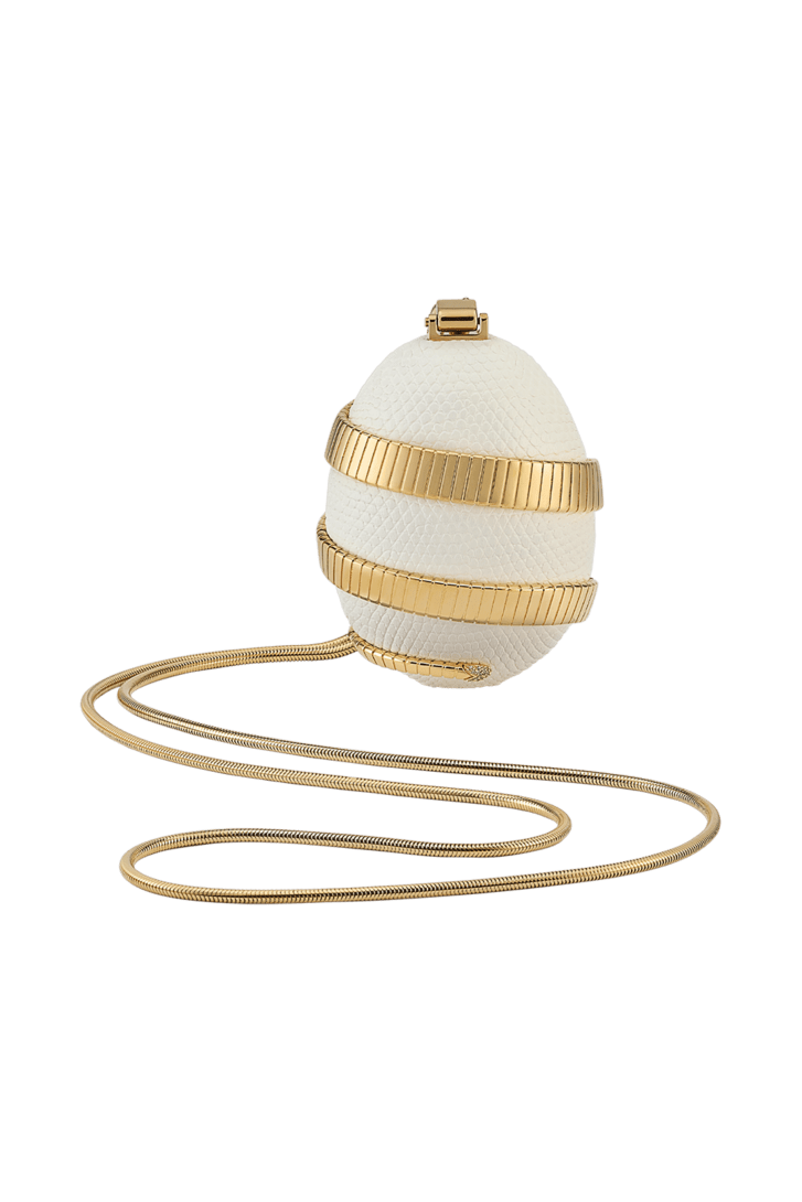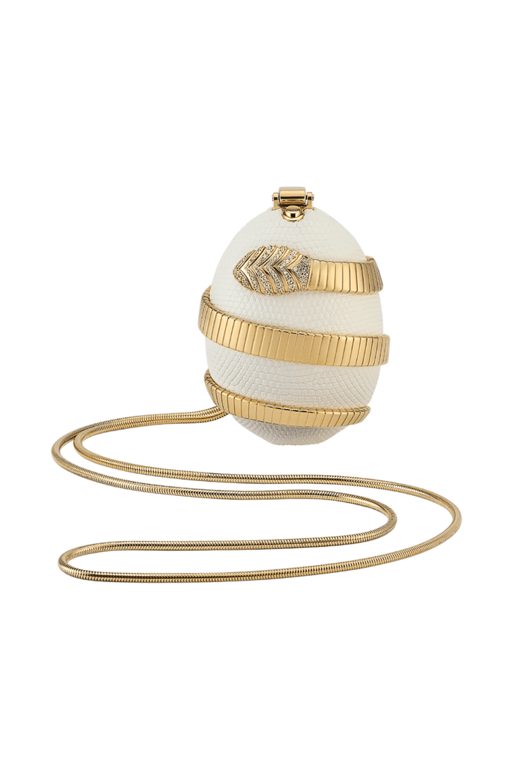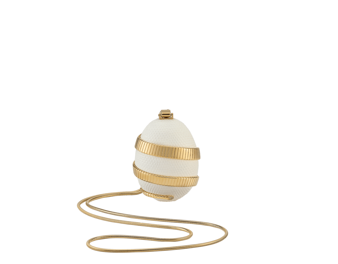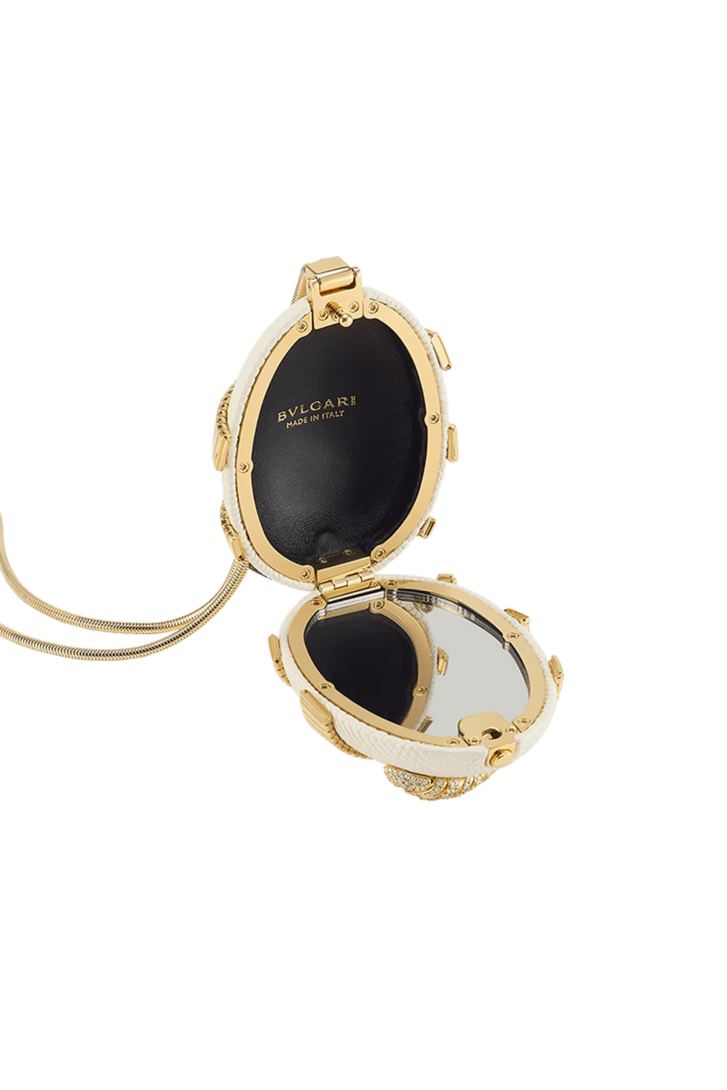 La collection Bvlgari Icons Minaudière en édition limitée réinterprète les symboles intemporels de Bvlgari, en créant une passerelle entre l’univers de la joaillerie et celui des accessoires avec des créations qui incarnent à la fois l’héritage et l’innovation. La minaudière Tubogas mini modèle présente une silhouette sculpturale en forme d’œuf, réalisée en cuir de lézard argenté perlé raffiné et ornée d’un élément Serpenti Tubogas sinueux en laiton doré s’enroulant autour de la création et illuminé par des détails en zircone sur la tête et la queue. Cette création est complétée par une chaîne arrondie sinueuse et comprend un compartiment unique avec une doublure en cuir nappa noir, un fermoir à bouton-pression et un miroir intérieur. Objet d’art raffiné, cette minaudière est accompagnée d’un livre miniature spécialement conçu par Sumayya Vally, « Notes on Finding Home », parfaitement adapté à sa forme. Modèle fabriqué en Italie.