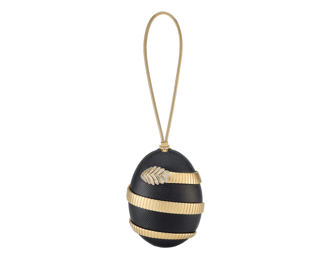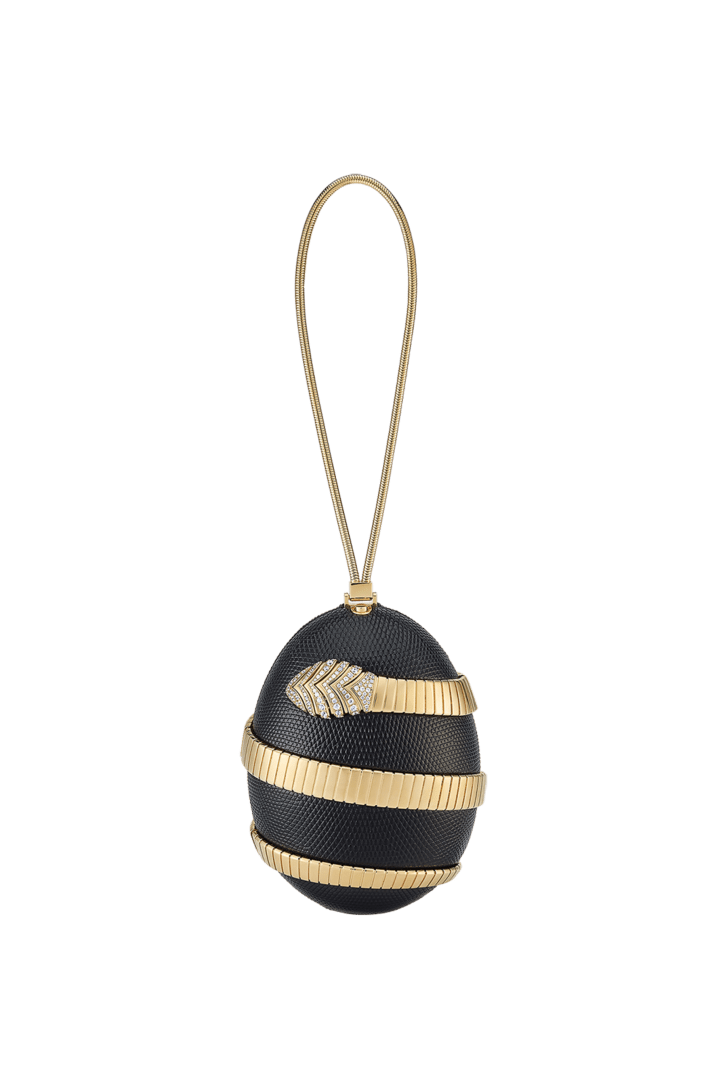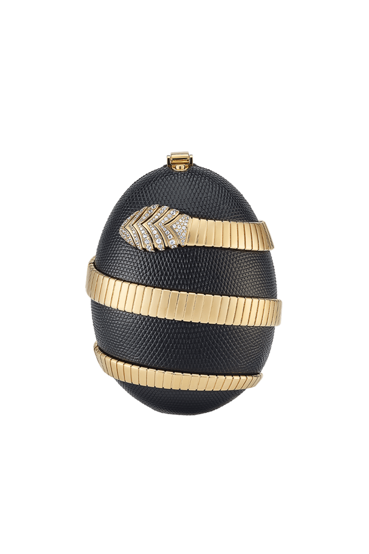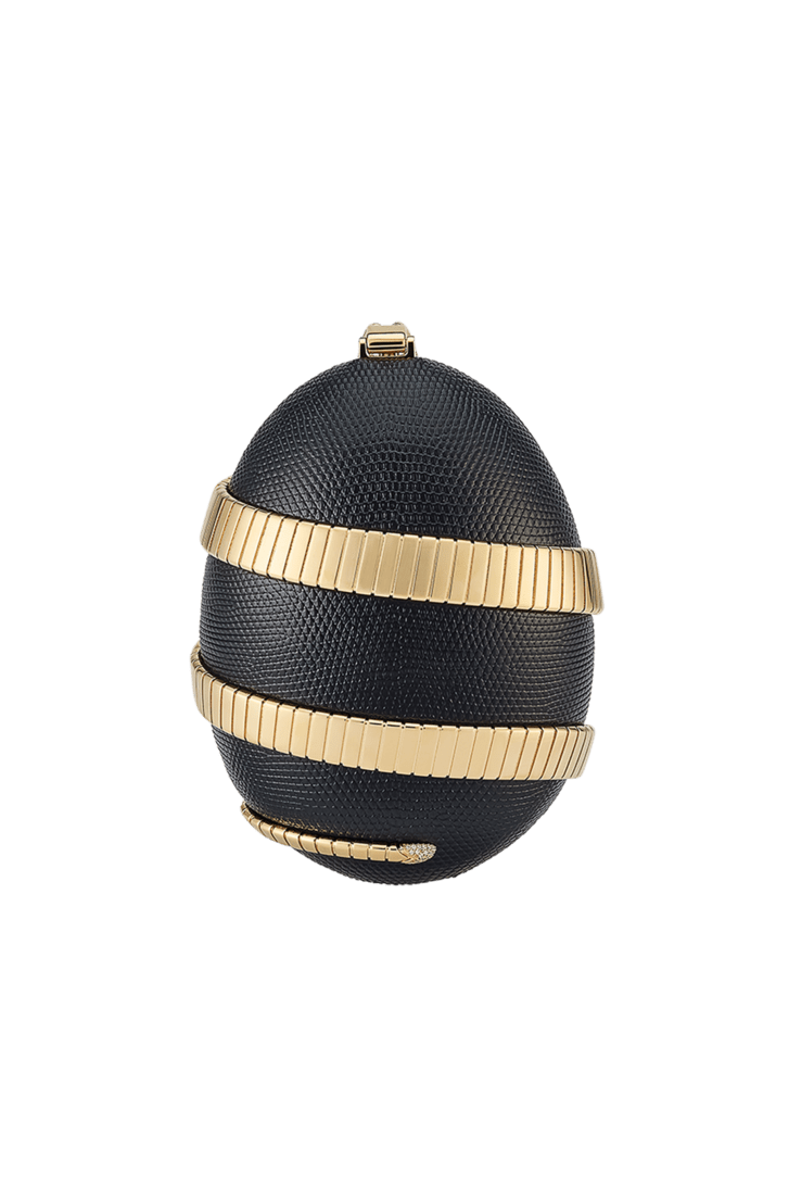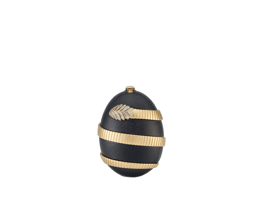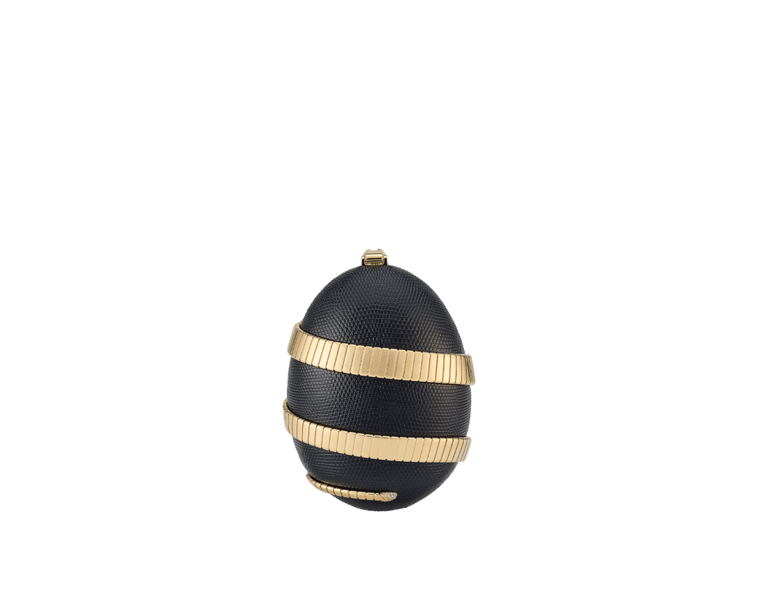 La collection Bvlgari Icons Minaudière en édition limitée réinterprète les symboles intemporels de Bvlgari, en créant une passerelle entre l’univers de la joaillerie et celui des accessoires avec des créations qui incarnent à la fois l’héritage et l’innovation. La minaudière Tubogas présente une silhouette sculpturale en forme d’œuf réalisée en laiton doré, recouverte de cuir de lézard noir raffiné et ornée d’un élément Serpenti Tubogas sinueux en laiton doré s’enroulant autour de la création et illuminé par des détails en zircone sur la tête et la queue. Cette création est complétée par une chaîne arrondie sinueuse qui permet de la porter à la main et comprend un compartiment unique avec une doublure en cuir nappa noir et un fermoir à bouton-pression. Objet d’art raffiné, cette minaudière est accompagnée d’un livre miniature spécialement conçu par Sumayya Vally, « Notes on Finding Home », parfaitement adapté à sa forme. Modèle fabriqué en Italie.
