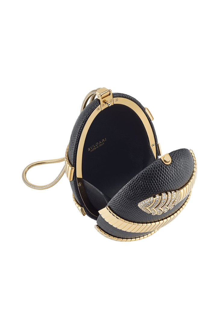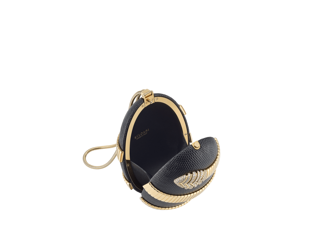 Minaudière Tubogas en cuir de lézard noir et détail Serpenti Tubogas en laiton doré avec éléments en zircone sur la tête et la queue ; fermoir à bouton-pression.