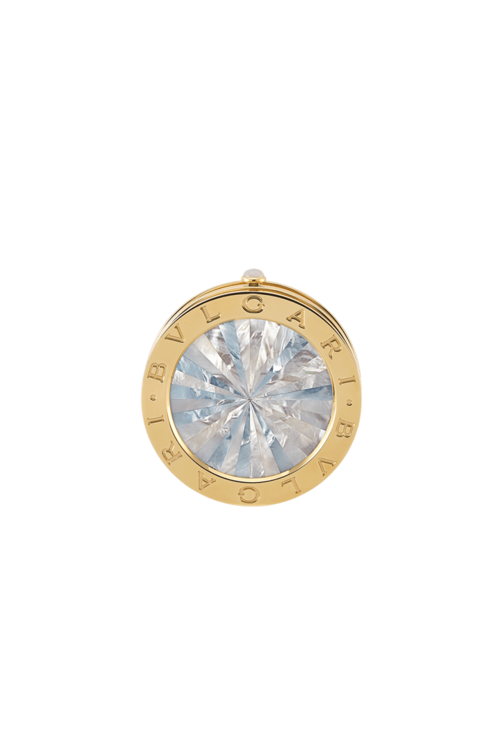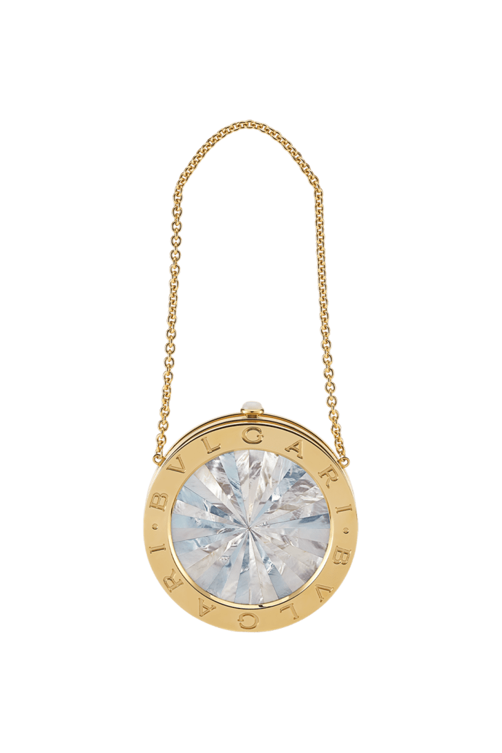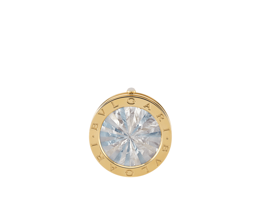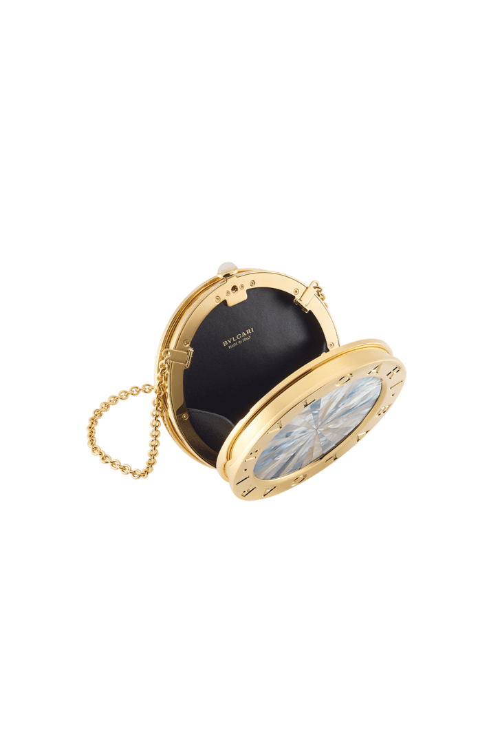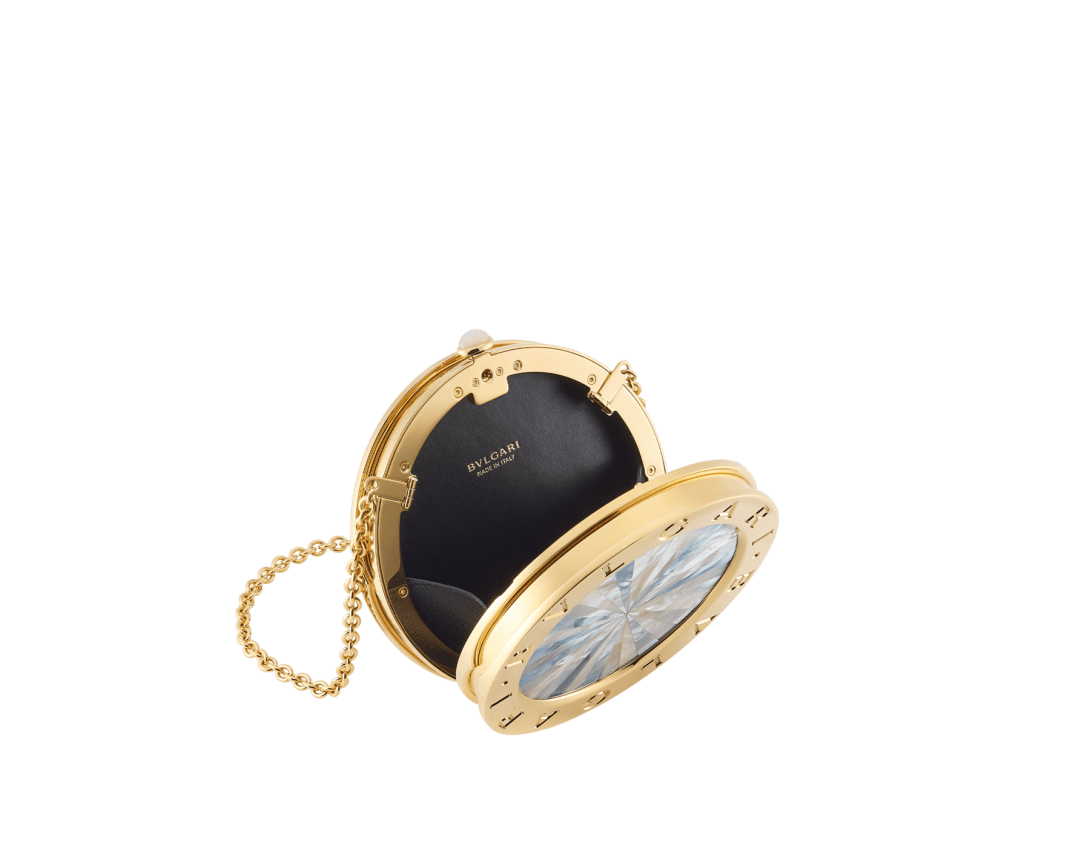 Minaudière BVLGARI BVLGARI en aluminium et laiton dorés avec intarsia d’éléments en nacre ; fermoir à bouton-pression avec élément en nacre.