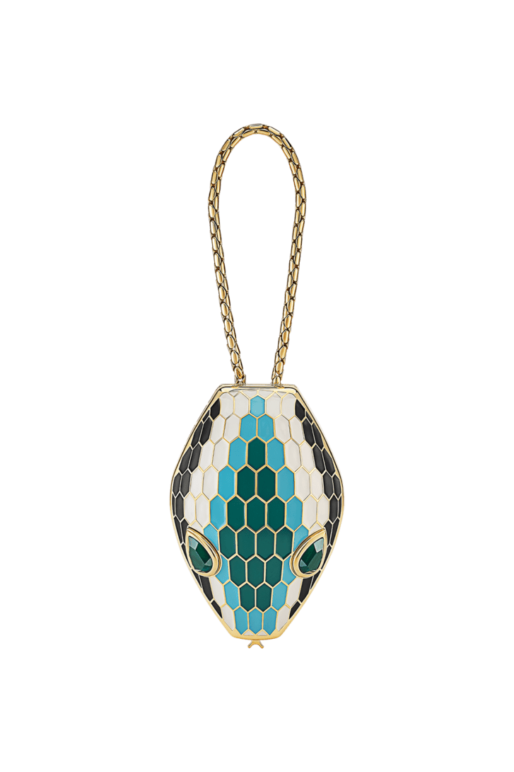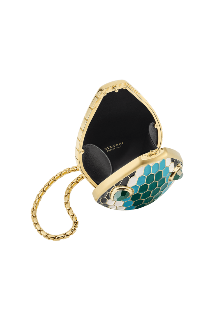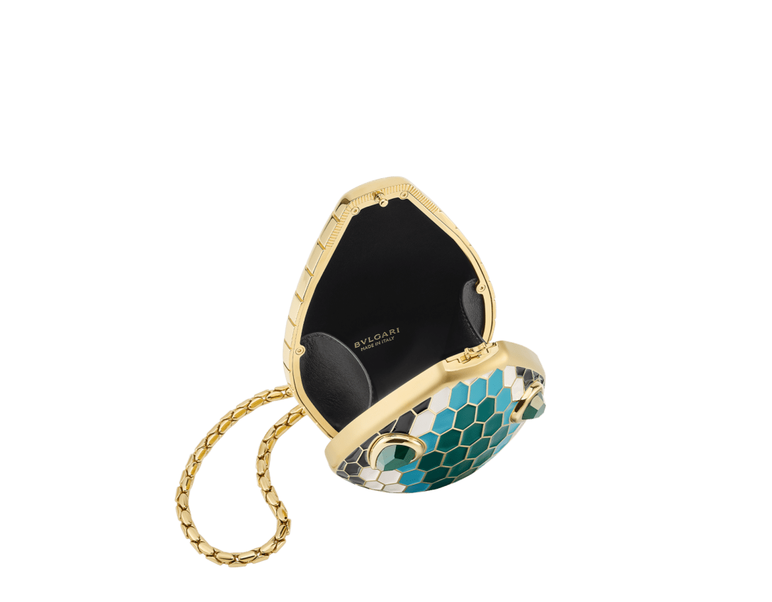 Minaudière Serpenti en aluminium et laiton dorés, rehaussée d’écailles en émail vert émeraude, turquoise feroza, blanc perlé et noir et d’yeux en cristal vert émeraude foncé ; fermoir à bouton-pression.