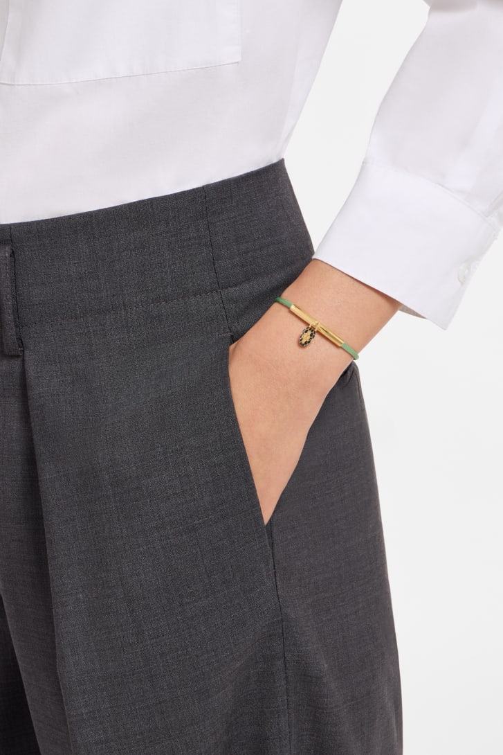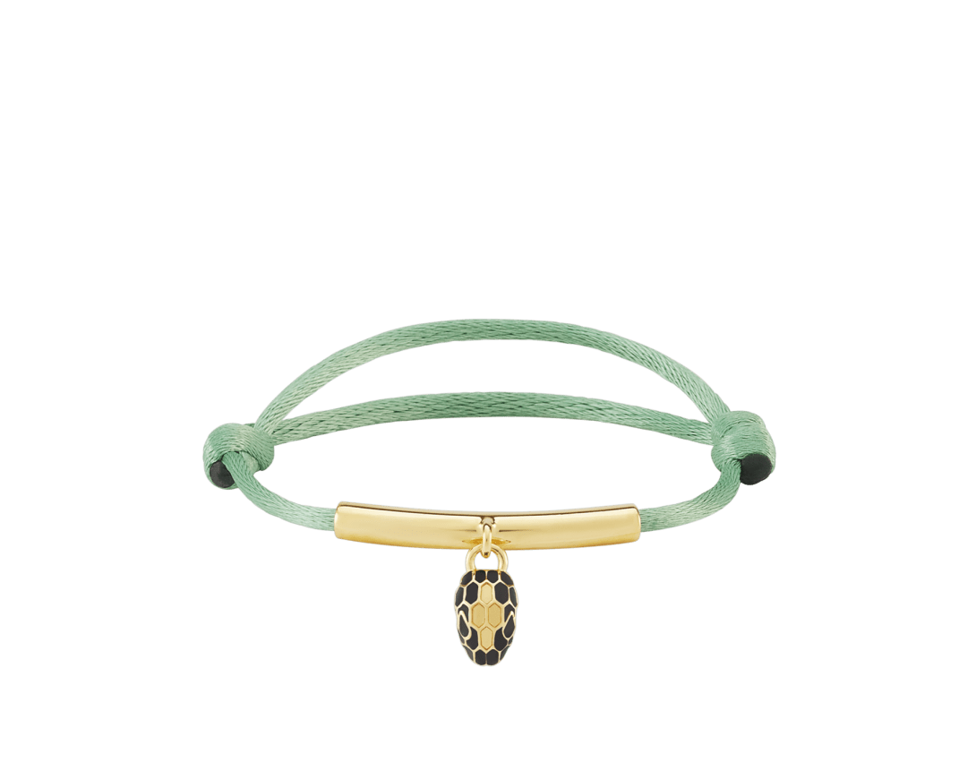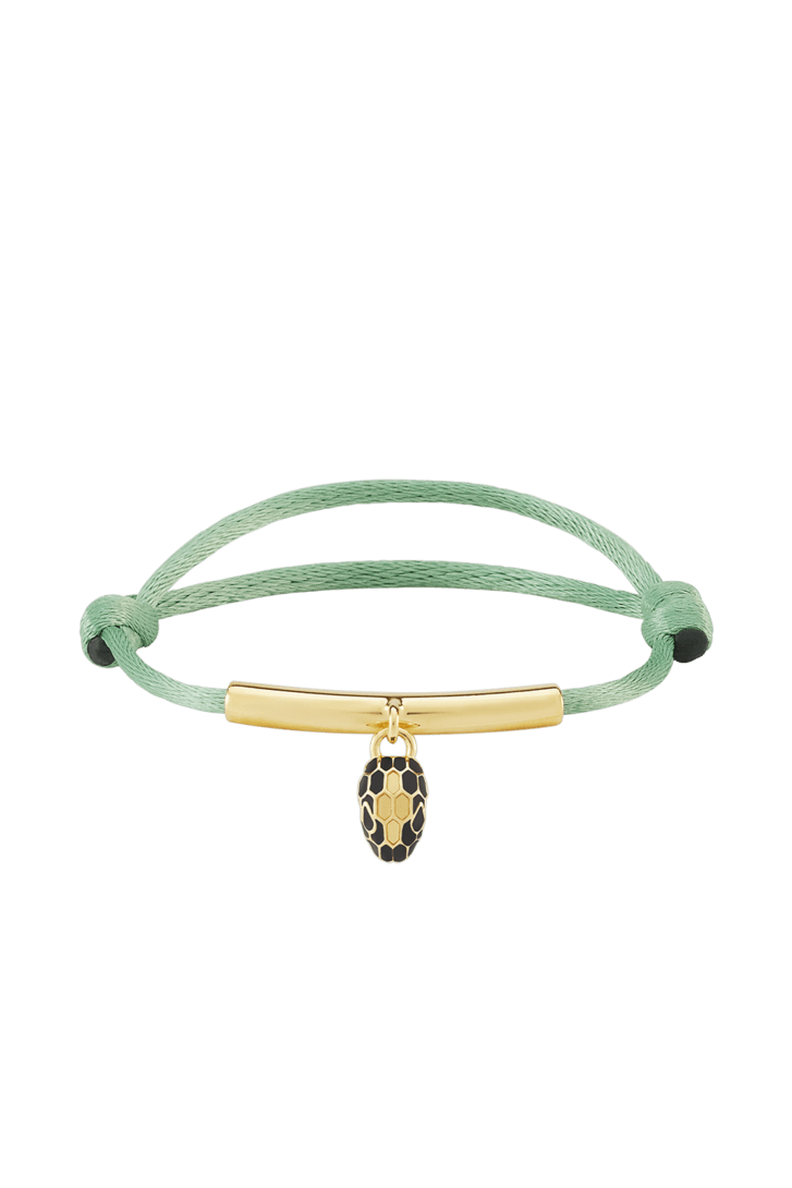 Bracelet Serpenti Forever en tissu couleur péridot clair. Élément tubulaire en laiton doré et pendentif Serpenti captivant rehaussé d’écailles en émail noir et transparent, et d’yeux en émail noir.