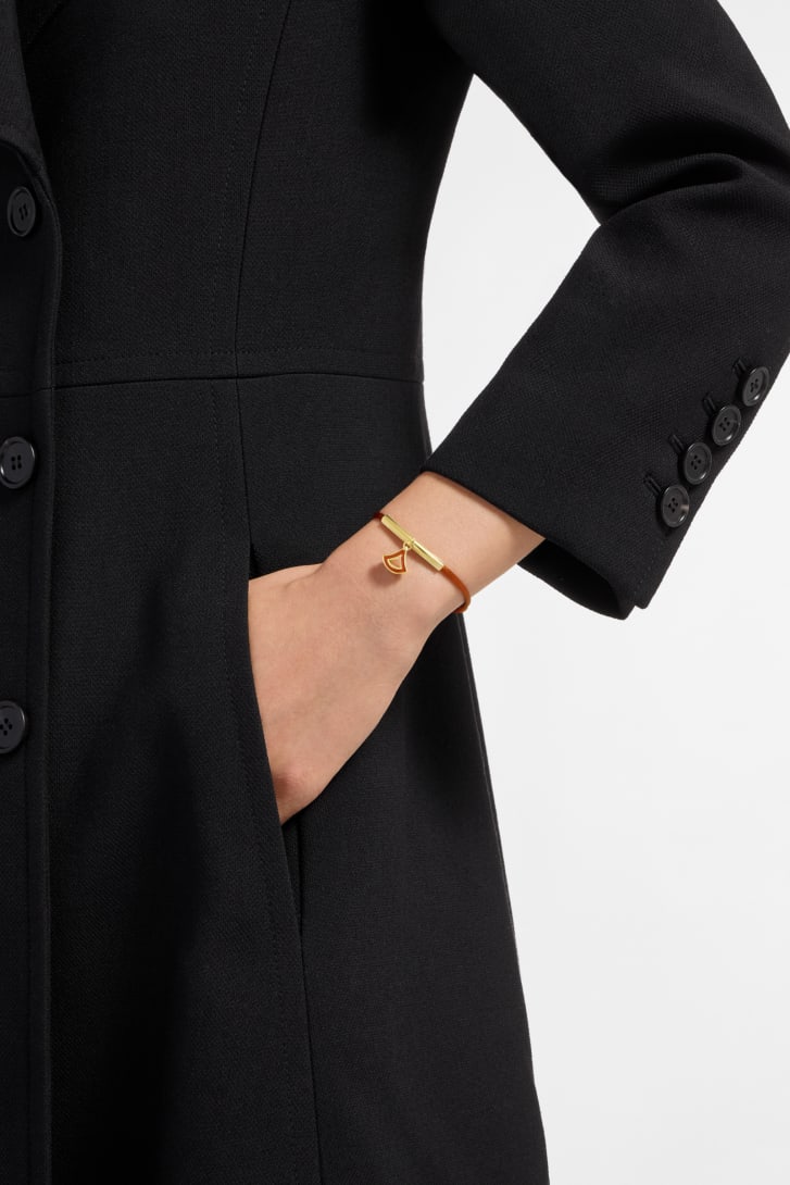 Bracelet Divas’ Dream en tissu couleur ambre. Véritable hommage à la féminité inspiré de la beauté éternelle de Rome et interprétation raffinée de l’emblématique motif de la collection, ce modèle arbore un pendentif en forme d’éventail rehaussé d’émail couleur cuivre. Taille unique, fermoir ajustable. Dimensions : de 12,5 cm à 22 cm (tour du poignet). Modèle fabriqué en Italie.
