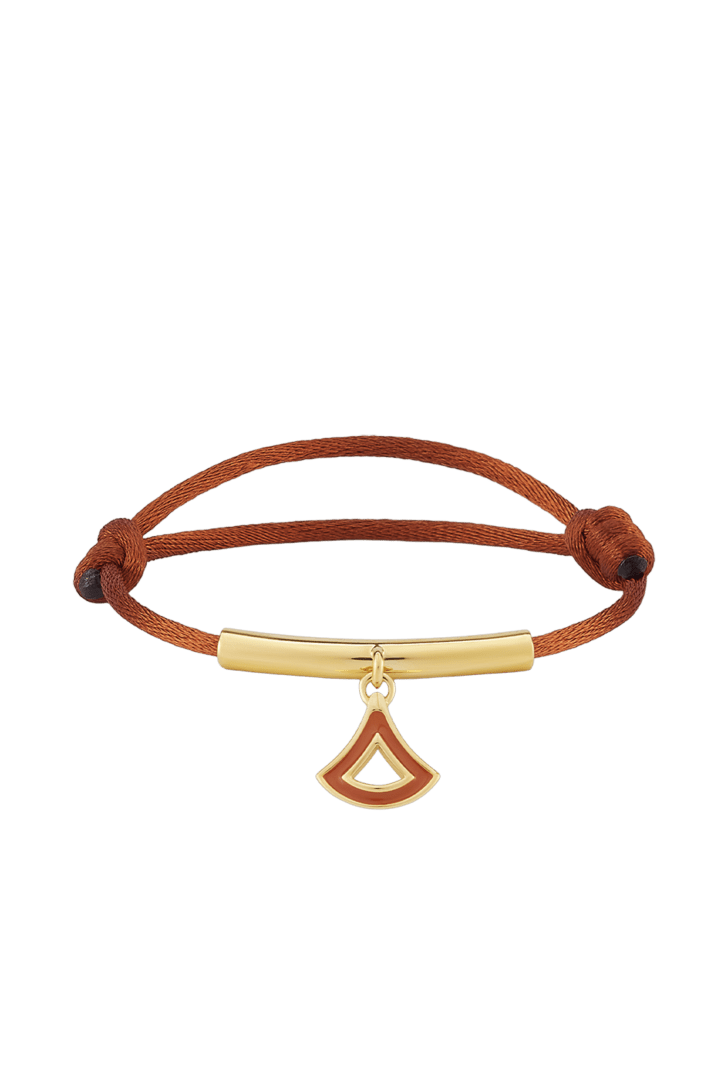 Bracelet Divas’ Dream en tissu couleur ambre. Élément tubulaire en laiton doré avec pendentif raffiné rehaussé d’émail couleur ambre.