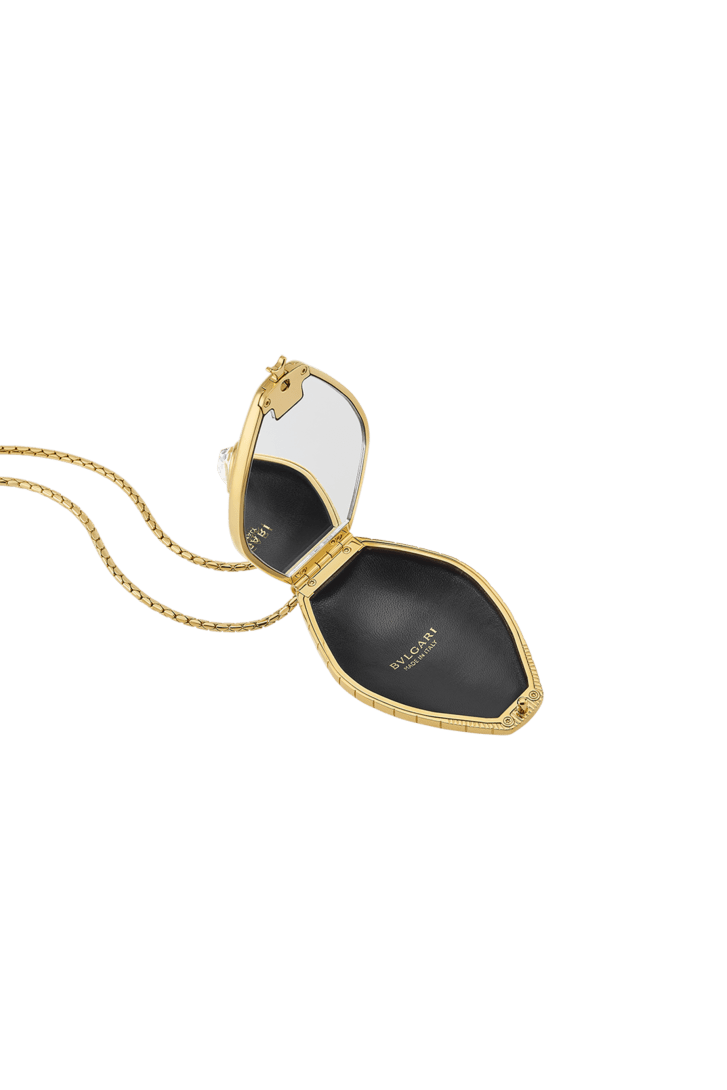 La collection Bvlgari Icons Minaudière en édition limitée réinterprète les symboles intemporels de Bvlgari, en créant une passerelle entre l’univers de la joaillerie et celui des accessoires avec des créations qui incarnent à la fois l’héritage et l’innovation. La minaudière Serpenti mini modèle présente une silhouette sculpturale prenant la forme de l’emblématique tête de serpent, réalisée en aluminium et laiton dorés et rehaussée d’écailles gravées. Cette création est complétée par une chaîne Cobra amovible inspirée du corps d’un serpent et comprend un compartiment unique avec une doublure en cuir nappa noir, un fermoir à bouton-pression et un miroir intérieur. Objet d’art raffiné, cette minaudière est accompagnée d’un livre miniature spécialement conçu par Linda Evangelista, « Notes on Honoring Tradition », parfaitement adapté à sa forme. Modèle fabriqué en Italie.