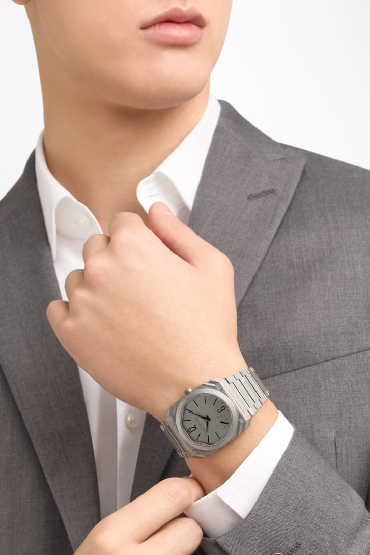 Vera icona del XXI secolo, l'orologio Octo Finissimo Automatic rappresenta un originale connubio tra l'audacia del design italiano e l'eccellenza dell'ingegneria svizzera. Dotato di una cassa del diametro di 37 mm e di un movimento ultrasottile a carica automatica con riserva di carica di 72 ore, l'orologio in titanio sabbiato unisce a un design dall’eleganza contemporanea una perfetta architettura interna. Emblema della maestria di Bvlgari nell’arte della gioielleria e dell’orologeria, la creazione riflette l’approccio distintivo della Maison alla lavorazione di materiali moderni e non convenzionali, nonché la sua abilità nel tracciare nuove tendenze del design nel panorama dell'orologeria svizzera.