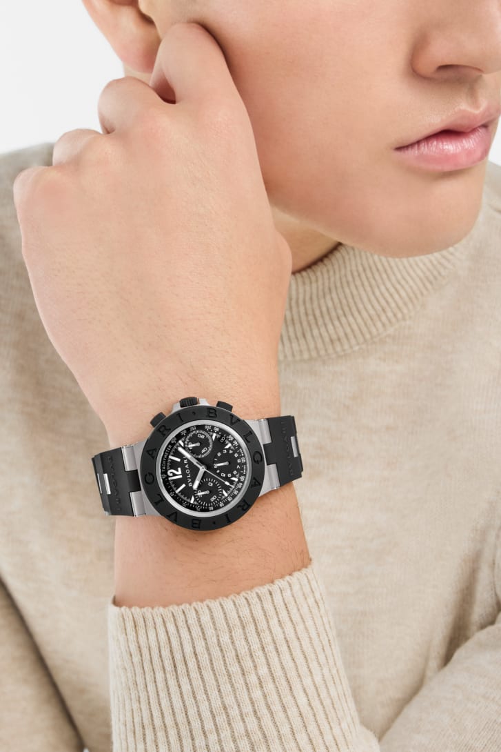 Orologio Bvlgari Titanio Chronograph con movimento meccanico di manifattura a carica automatica, cronografo, cassa di 41 mm in titanio sabbiato, lunetta e cinturino in caucciù nero, quadrante nero. Impermeabile fino a 100 metri.