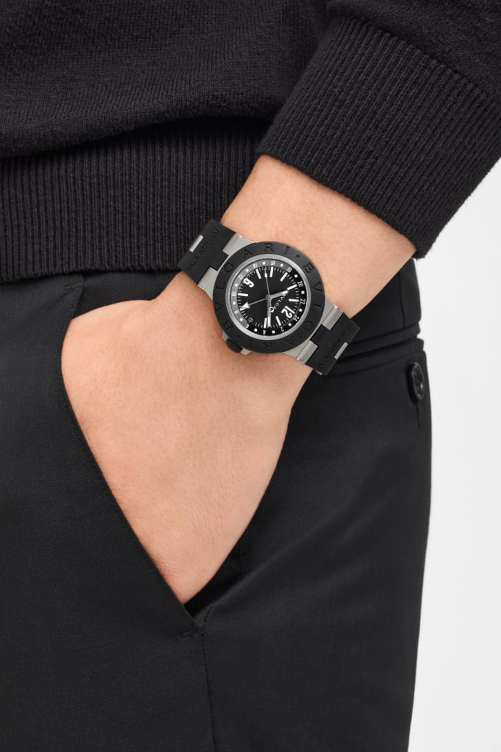 Sin dal lancio della prima generazione di modelli nel 1998, Bvlgari Aluminium ha ridefinito i canoni dell’orologeria sportiva di lusso. Perfetta espressione dello stile impareggiabile e del fascino versatile dell'iconico modello originario, Bvlgari Titanio GMT unisce alla forza del titanio la moderna eleganza del caucciù nero, mentre la funzione GMT integrata dona al modello un tocco di dinamismo. Richiamando i codici distintivi del design Bvlgari, l'orologio è un'icona di stile e maestria all'avanguardia.