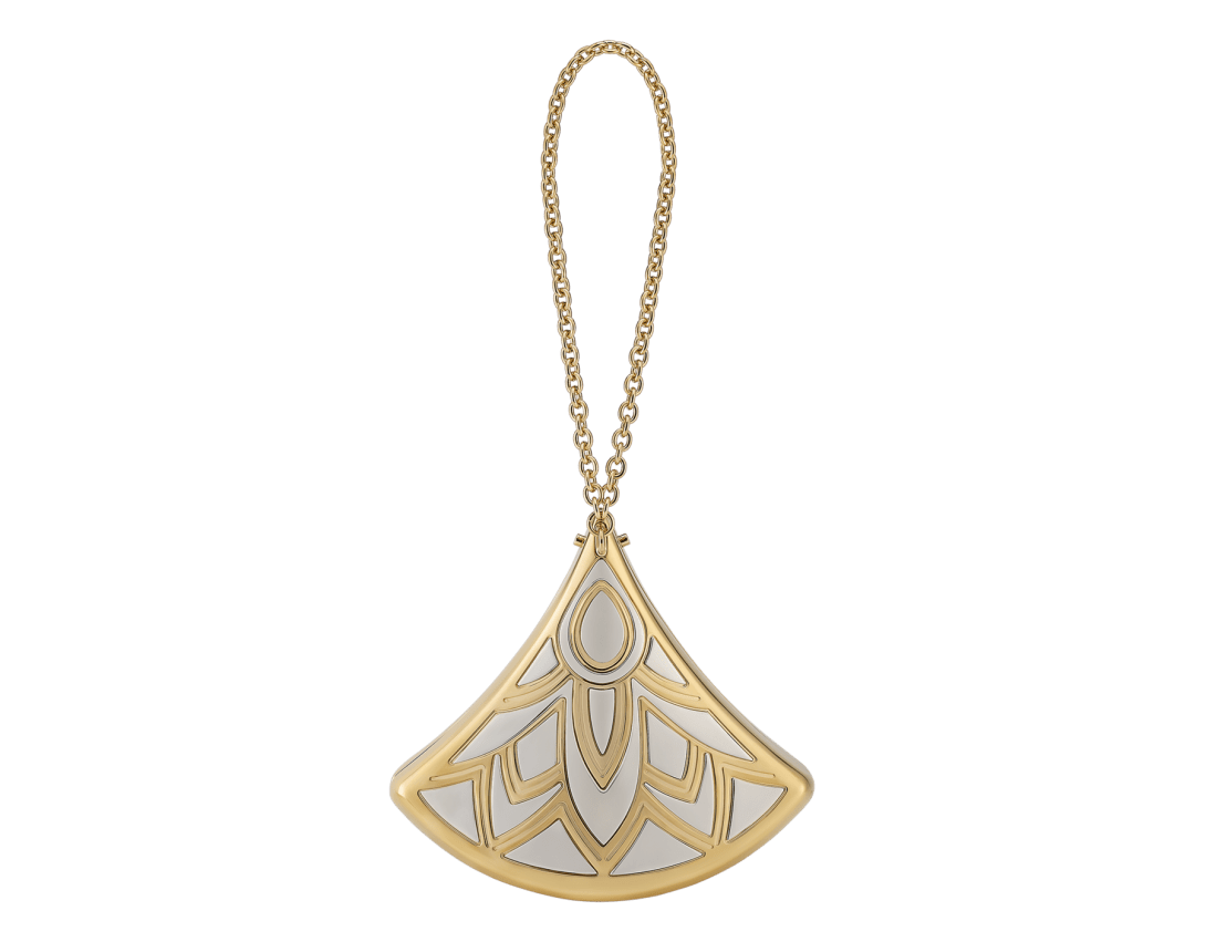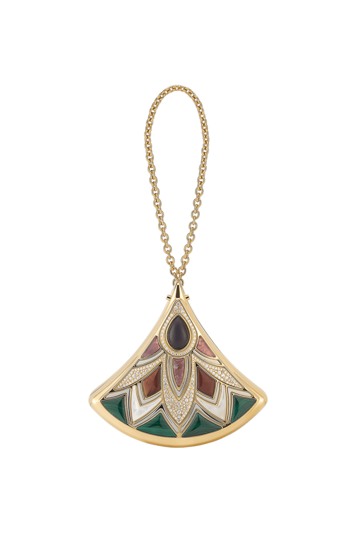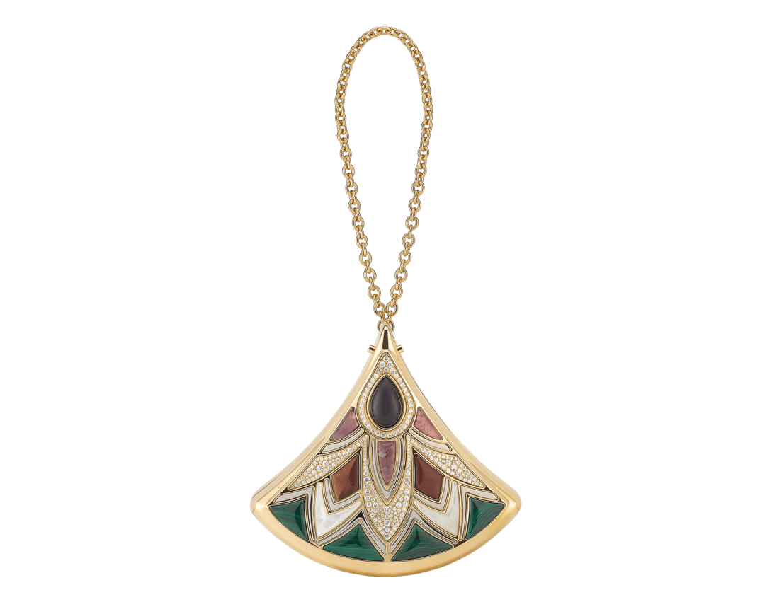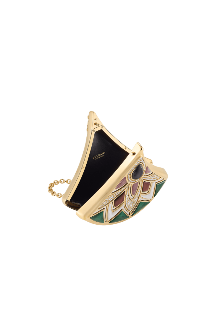 Portando l'arte della gioielleria nel mondo degli accessori, la collezione Bvlgari Icons Minaudière in edizione limitata rivisita gli iconici simboli Bvlgari per dar vita a un perfetto connubio fra tradizione e innovazione. Realizzata in oro con finiture alluminio e ottone con finiture palladio, la minaudière Divas’ Dream presenta una scultorea silhouette a ventaglio ispirata ai mosaici romani delle Terme di Caracalla, adornata da intricati inserti di gemme colorate e da uno scintillante pavé di zirconi. A completare la creazione, una catena utilizzabile come impugnatura a mano, uno scomparto singolo con fodera in nappa nera e una chiusura con bottone a pressione. Preziosa come un'opera d'arte, la minaudière è accompagnata da un libro in miniatura, "Notes on Cultivating Inner Calm" di Kim Ji-won, appositamente realizzato per adattarsi alle dimensioni della borsa. Una creazione interamente realizzata in Italia.