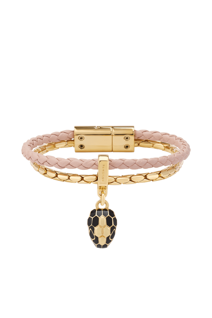 Bracciale Serpenti Forever in vitello intrecciato rosa chiaro con catena in ottone placcato oro e chiusura magnetica a scatto. Accattivante ciondolo Serpenti con squame in smalto nero e ottone placcato oro e occhi in smalto nero.