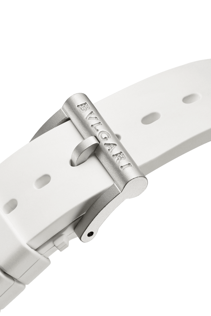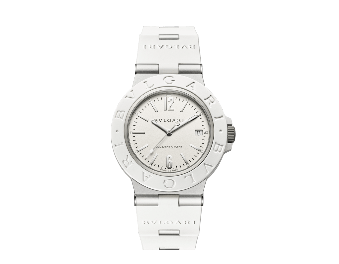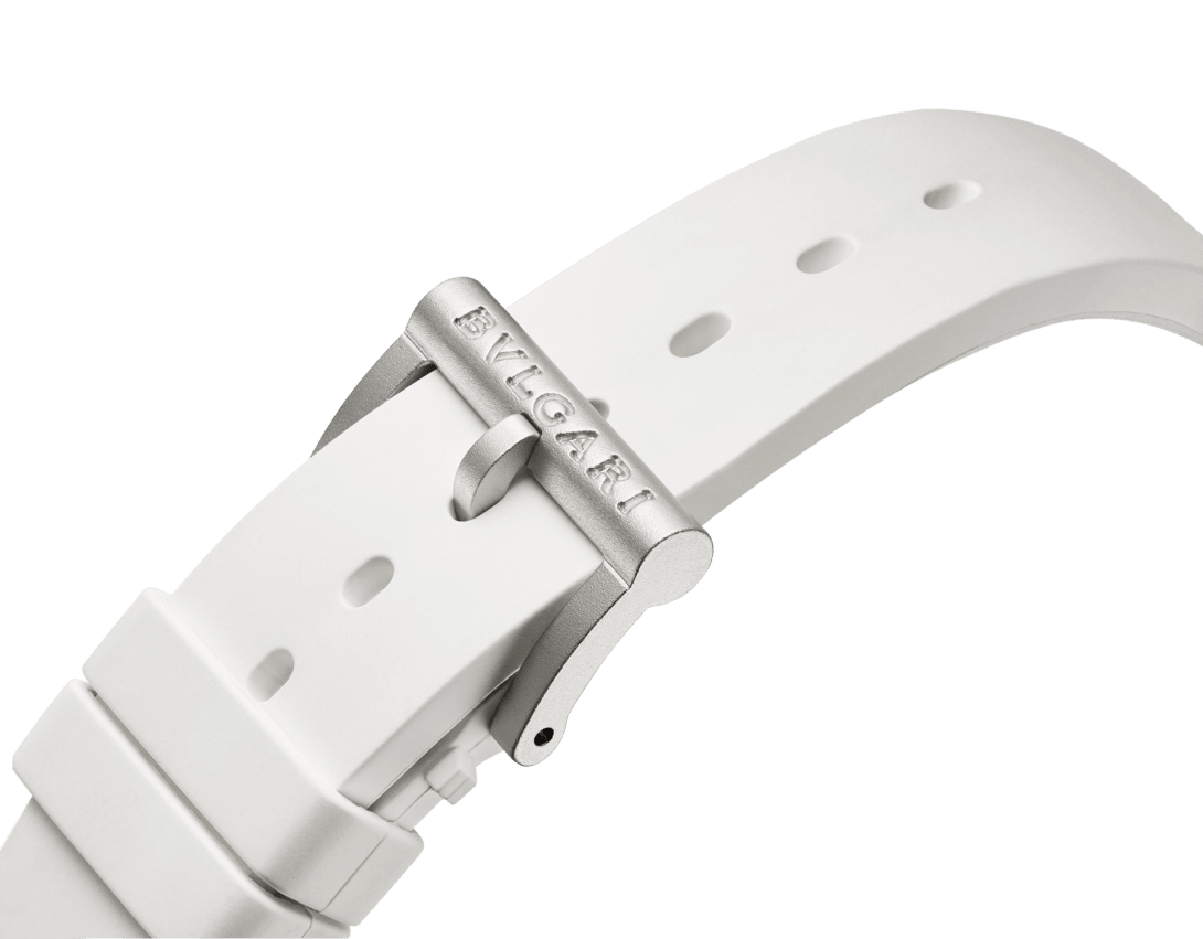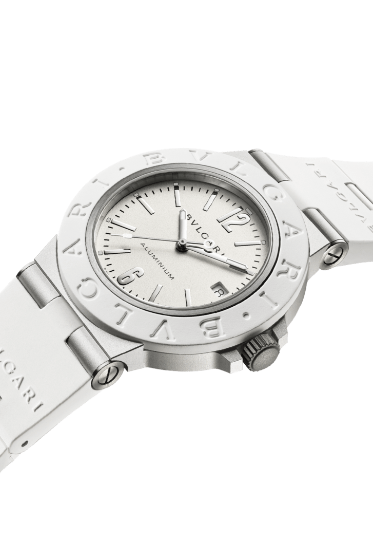 ブルガリ アルミニウム ホワイト オートマティック ウォッチ。機械式マニュファクチュールムーブメント。自動巻き。時・分・中央秒針・日付表示。キャリバーB77(厚さ3.60mm)、42時間パワーリザーブ。振動数28,800振動/時(4ヘルツ)。40mmのサンドブラスト加工を施したアルミニウム製ケース。ブルガリ・ブルガリのエングレーヴィングを施したホワイトのラバー製ベゼル。ヴァーニッシュホワイトのオパーリンダイアルにロジウム仕上げのインデックス。ポリッシュロジウム仕上げのブラス製時針・分針にスーパールミノバ®。ポリッシュロジウム仕上げのブラス製中央秒針の先端にホワイトラッカー、3時位置に日付表示窓、サンドブラスト仕上げチタニウム製リューズ。サンドブラスト加工とサテン仕上げのチタン製ケースバック。ホワイトのラバー製ブレスレットにサンドブラスト加工を施したアルミニウム製リンクとピンバックル。100メートル防水。
