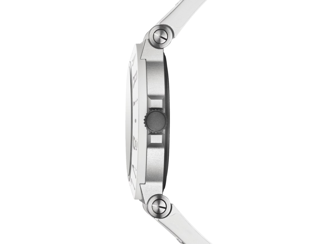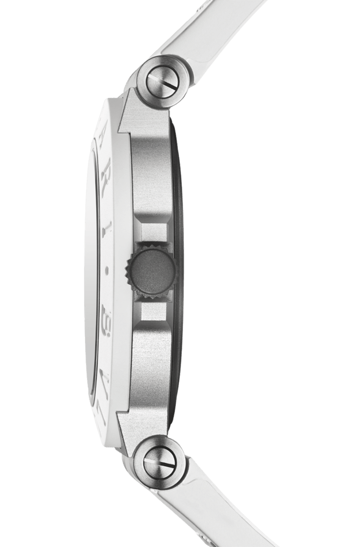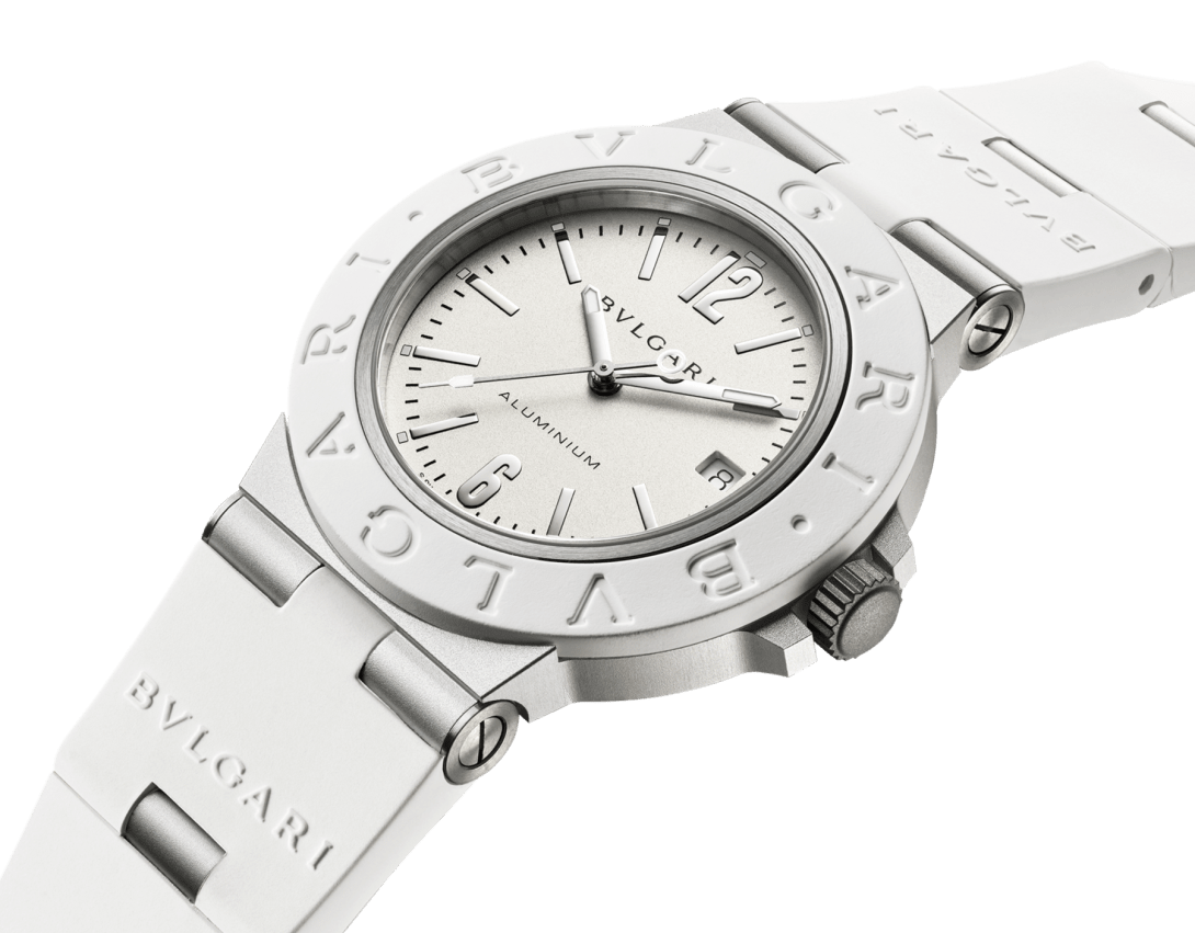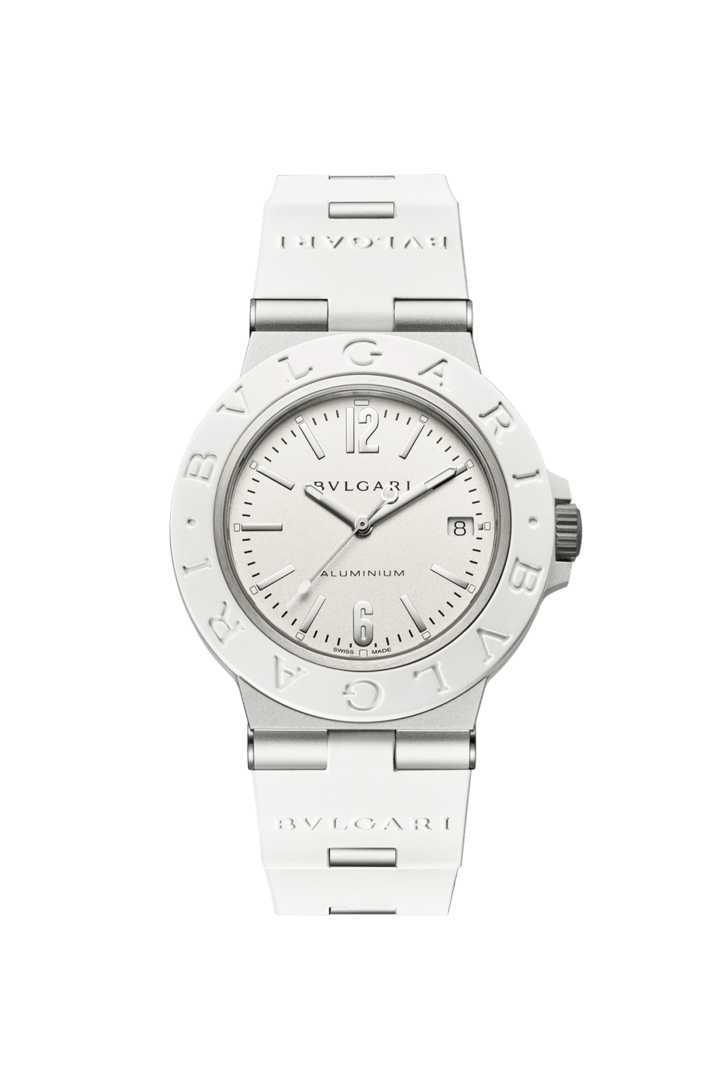 ブルガリ アルミニウム ホワイト オートマティック ウォッチ。機械式マニュファクチュールムーブメント。自動巻き。時・分・中央秒針・日付表示。キャリバーB77(厚さ3.60mm)、42時間パワーリザーブ。振動数28,800振動/時(4ヘルツ)。40mmのサンドブラスト加工を施したアルミニウム製ケース。ブルガリ・ブルガリのエングレーヴィングを施したホワイトのラバー製ベゼル。ヴァーニッシュホワイトのオパーリンダイアルにロジウム仕上げのインデックス。ポリッシュロジウム仕上げのブラス製時針・分針にスーパールミノバ®。ポリッシュロジウム仕上げのブラス製中央秒針の先端にホワイトラッカー、3時位置に日付表示窓、サンドブラスト仕上げチタニウム製リューズ。サンドブラスト加工とサテン仕上げのチタン製ケースバック。ホワイトのラバー製ブレスレットにサンドブラスト加工を施したアルミニウム製リンクとピンバックル。100メートル防水。