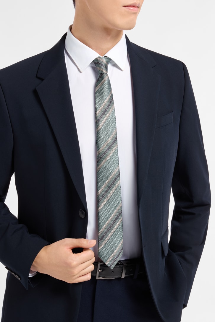 アクアマリンの上質なジャカードシルク製ロゴ カレイドス セブンフォールドタイ。ブルガリのシグネチャーを、タイムレスなサテン地のレジメンタルスタイルで表現されたリズミカルなパターンへと昇華させています。交互に現れるストライプが、カラーと織りの両方でコントラストを描くことで、万華鏡が持つ多面的な魅力を想起させる質感のダイナミックな交錯を生み出しています。洗練された個性的なデザインで、上品な装いの仕上げに理想的なアクセサリーです。7 x 145 cm – 2.8 x 57.1"。シルク100%。ハンドメイド、イタリア製。
