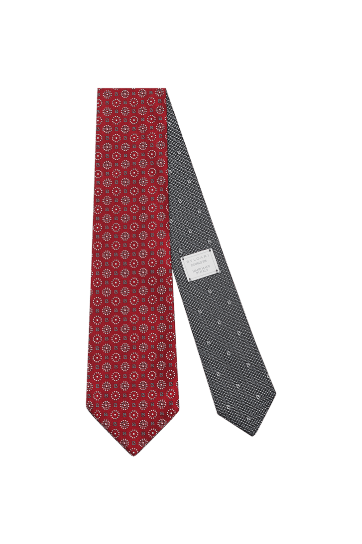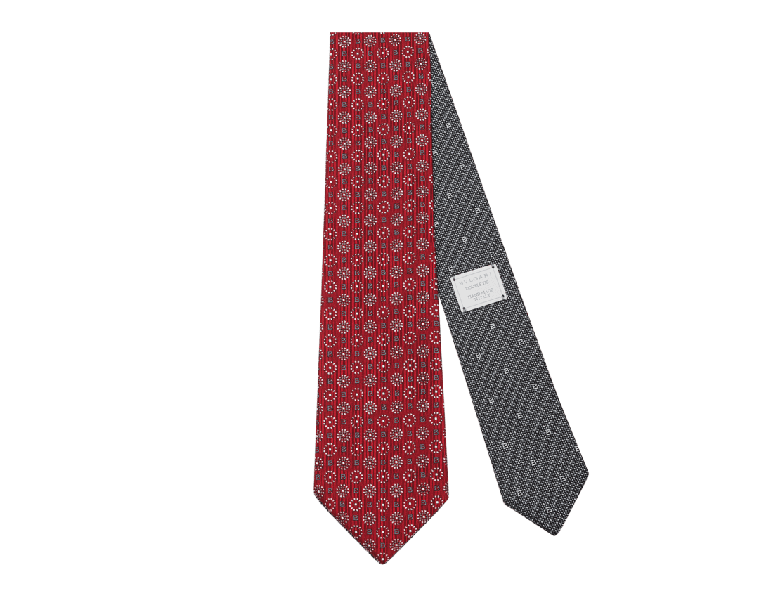 レッドとグレーの上質なジャカードシルク製ダブル B ポワ ダブルフェイスタイ。クラシックなモチーフをブルガリならではのスタイルで表現しています。片面ではBVLGARIの「B」がフラワーモチーフやポルカドットに溶け込み、もう一方の面にはタイムレスなニードルポイントのデザインが施されています。洗練された装いに理想的な、あらゆるシーンで活躍するアクセサリーです。Bvlgariロゴ入りメタル製タグをあしらい、片面に「Handmade in Italy」の文字を施して仕上げています。7 x 147 cm - 2.8 x 57.9"。シルク100%。ハンドメイド、イタリア製。