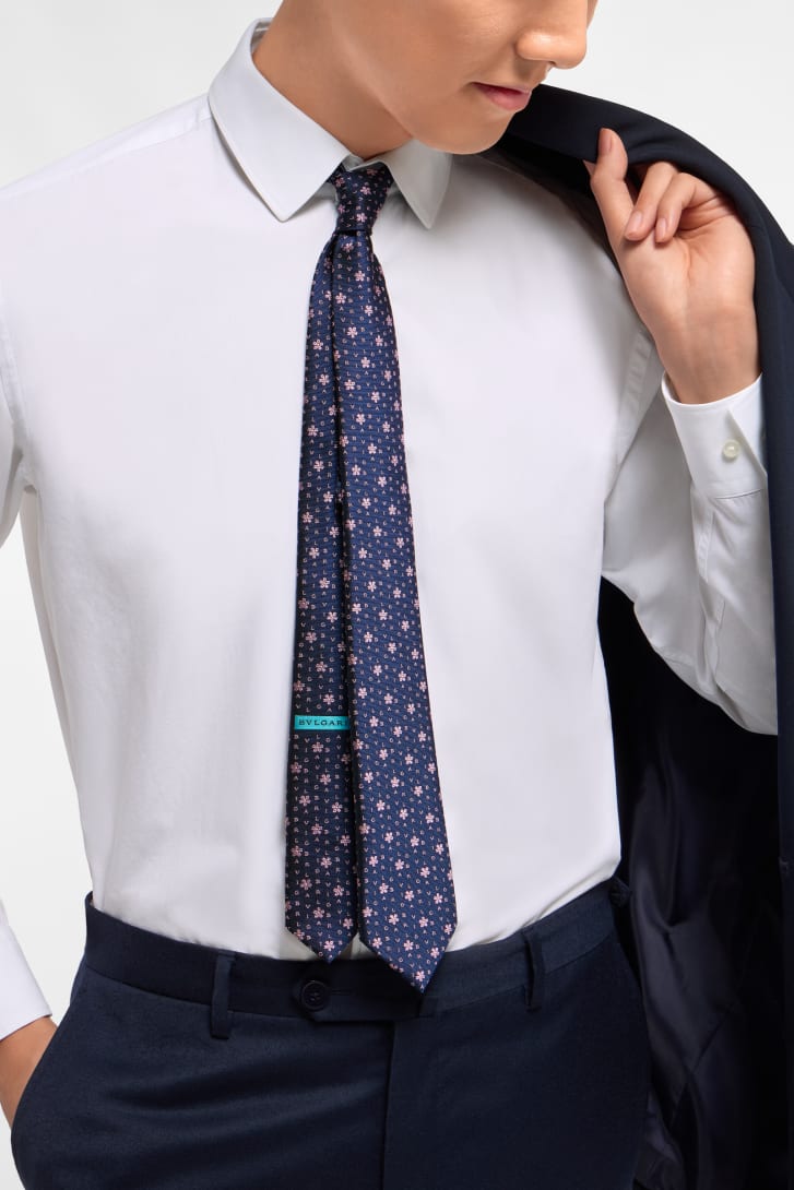 ダークブルーの上質なジャカードシルク製ロゴ ハナミ セブンフォールドタイ。ブルガリのシグネチャーを、咲き誇る桜の花の中に浮かび上がるようなレタリングモチーフとして再解釈しています。洗練されたジャカード技法が、繊細な奥行きと質感でデザインを引き立て、日本の花見の伝統が持つ詩的なエレガンスを呼び起こします。洗練された個性的なデザインで、上品な装いの仕上げに理想的なアクセサリーです。7 x 145 cm – 2.8 x 57.1"。シルク100%。ハンドメイド、イタリア製。