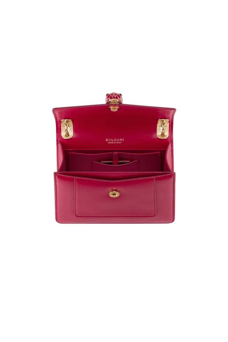 時を超えても褪せることのないモデルを現代的に進化させたセルペンティ フォーエバー デイトゥナイト スモールショルダーバッグ。ロイヤルルビーのカーフレザー製。多様なシーンで活躍するそのエレガントでアイコニックなデザインの現代的なメタモーフォシスが表現されています。 スライドするスネークボディの形をしたチェーンストラップ。60年代のセルペンティ ジュエリーから着想を得たうろことデザインが不思議な魅力を放つアイコニックなスネークヘッド マグネット式クロージャー。 コンパートメント×1。前面と背面にパッチポケット×各1。内側にオープンポケット×1。内側にカスタマイズ可能なミラー付きミラーポケット×1。背面にBULGARIメタルロゴ。 19 x 14 x 6 cm - 7.5 x 5.5 x 2.4" イタリア製。
