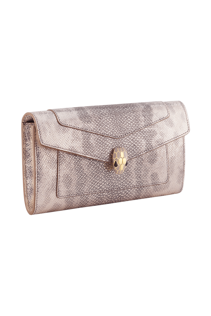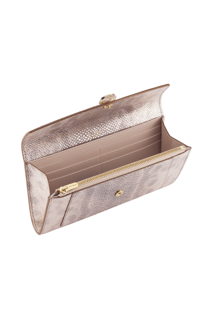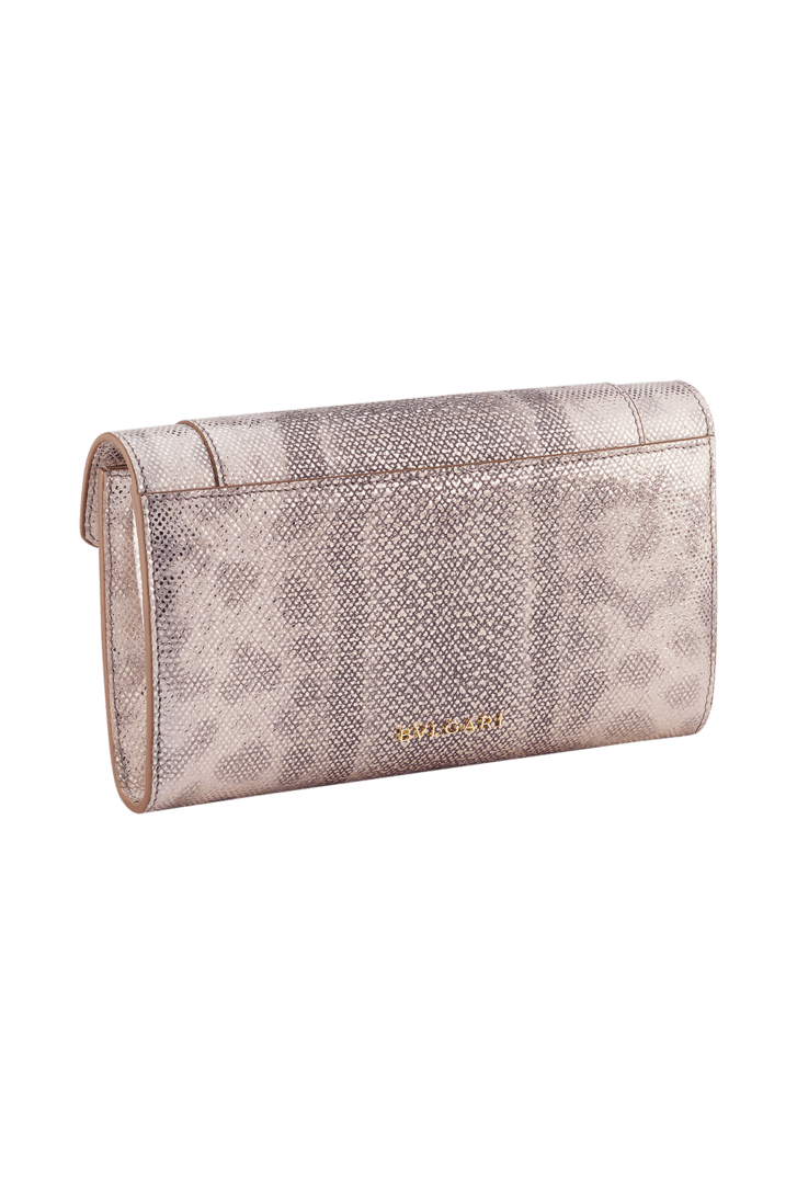 外側はミルキーオパールのメタリックカルング、内側はミルキーオパールのナッパレザーでつくられた、セルペンティ フォーエバー ロングウォレット。ソフトな雰囲気とスリムな外観で、紛うことなき美的コードを刷新。 アイコニックなスネークヘッド マグネット式クロージャーのフラットなバージョン。彩色を施したヒプノティックなうろことデザインは、60年代のセルペンティ ジュエリーに由来します。スネークボディの形をしたチェーンとレザー製ストラップをあしらったクリエイション。 フラップクロージャー×1。コンパートメント×1。背面外側にフラットポケット。内側にジップ付きポケット。カードスロット6枚分。フラットポケット×1。背面にメタル製Bvlgariロゴ。 19 x 10 x 3.8cm - 7.5 x 3.9 x 1.5" イタリア製。