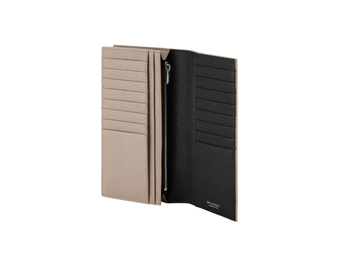 外側はフォギーオパール、内側はブラックのグレインカーフレザーを使用したブルガリ・ブルガリ マン ラージウォレット。アイコニックなBULGARIダブルロゴの装飾。 フォールデッドクロージャー。クレジットカードスロット16枚分。紙幣入れ×1 。ジップ付き小銭入れ×1。その他内側にポケット×5。 10 x 18 x 2cm - 3.9 x 7.1 x 0.8" イタリア製。