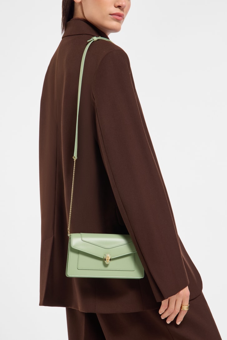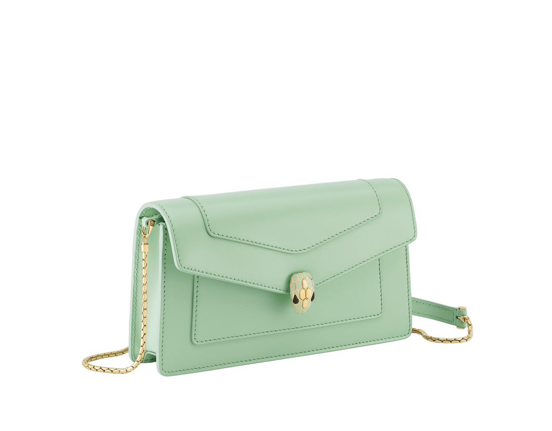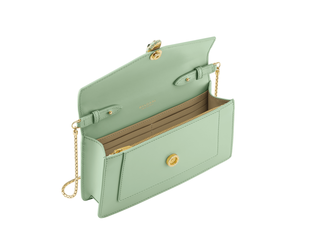外側にライトペリドットのカーフレザー、内側にブライトトラベルティーノのナッパレザーを使用したセルペンティ フォーエバー チェーンポシェット。アイコニックなマグネット式スネークヘッドクロージャー。そのヒプノティックなカラーのうろことデザインは、60年代のセルペンティ ジュエリーから着想を得ています。スネークボディの形をしたチェーンとレザーストラップが付属。フラップクロージャー。コンパートメントx1。外側背面にポケットx1。内側にジップ付きポケットx1。クレジットカードスロット6枚分。フラットポケットx1。背面にBvlgariメタルロゴ。 イタリア製。
