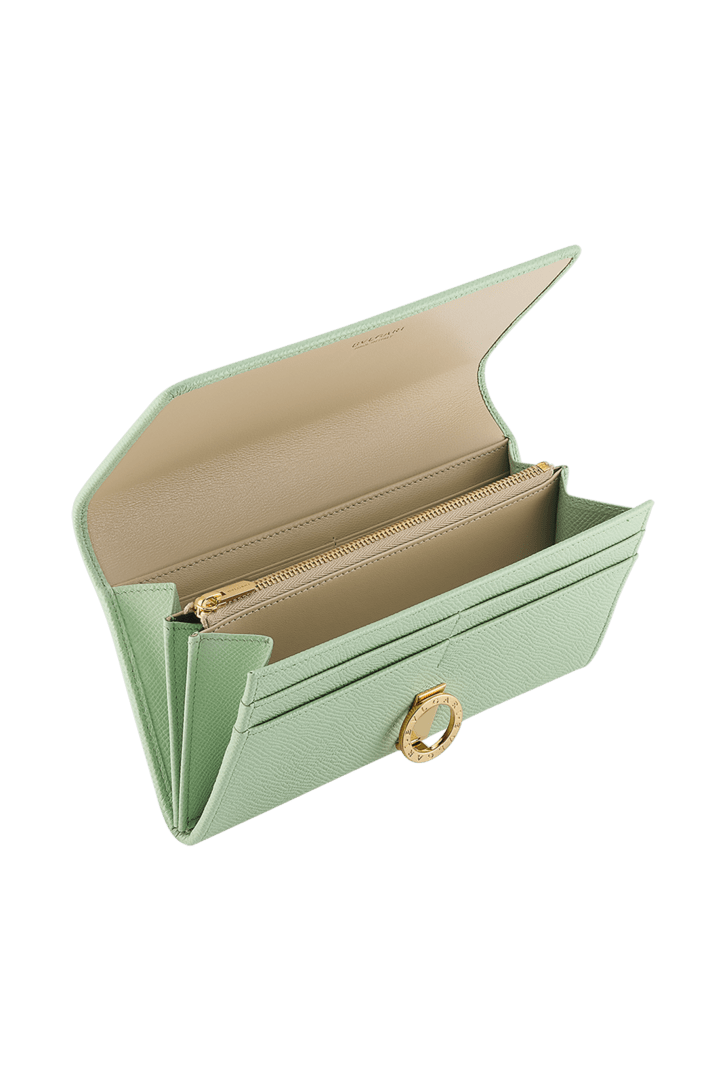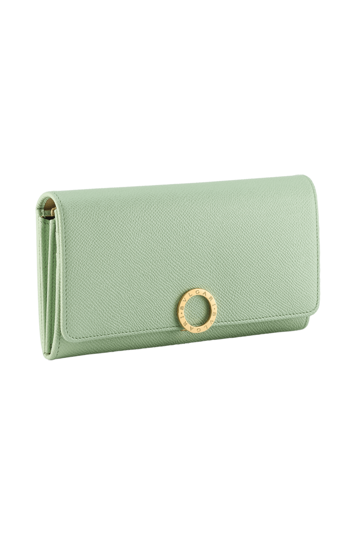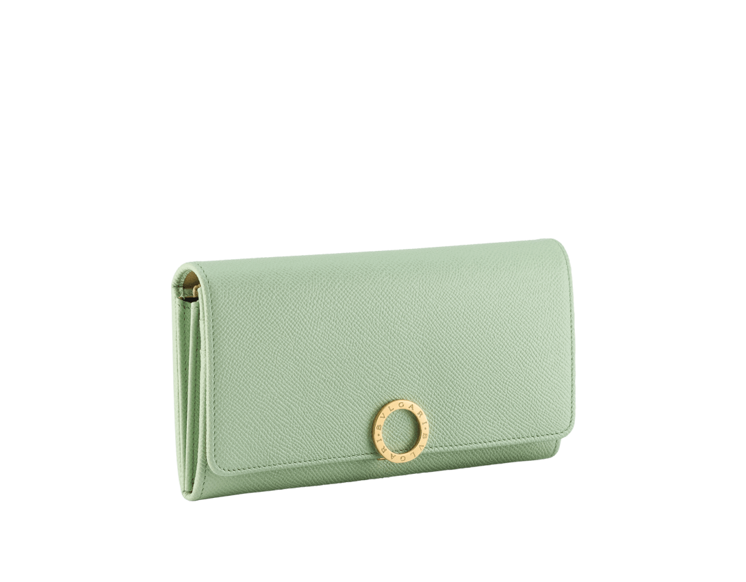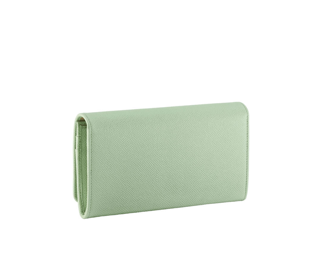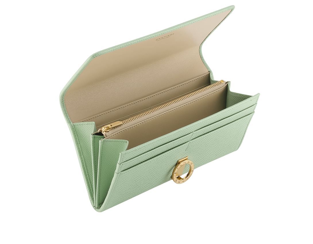 外側にライトペリドットのブライトグレインカーフレザー、内側にブライトトラベルティーノのナッパレザーを使用したブルガリ・ブルガリ ラージウォレット。クリップ付きの二つ折りクロージャー。アイコニックなBvlgariダブルロゴの装飾。クレジットカードスロット16枚分。紙幣入れ×2。コインポケット×1。ポケット×1。イタリア製。