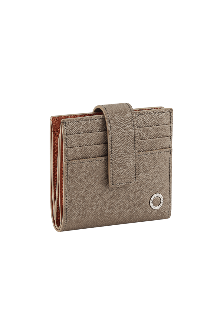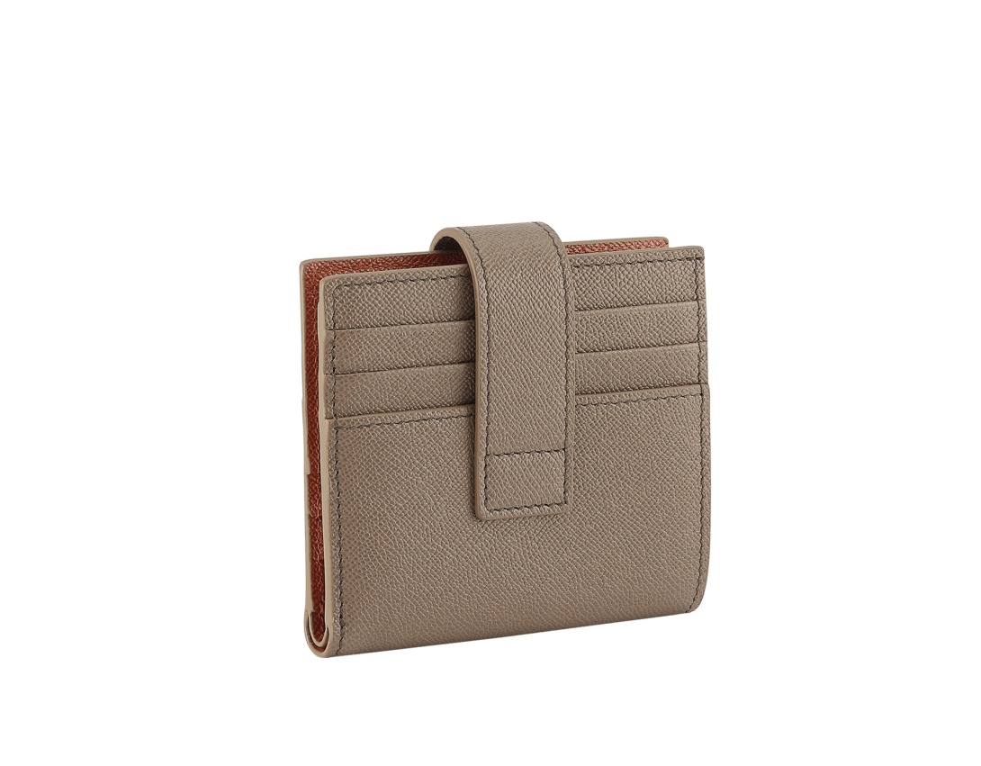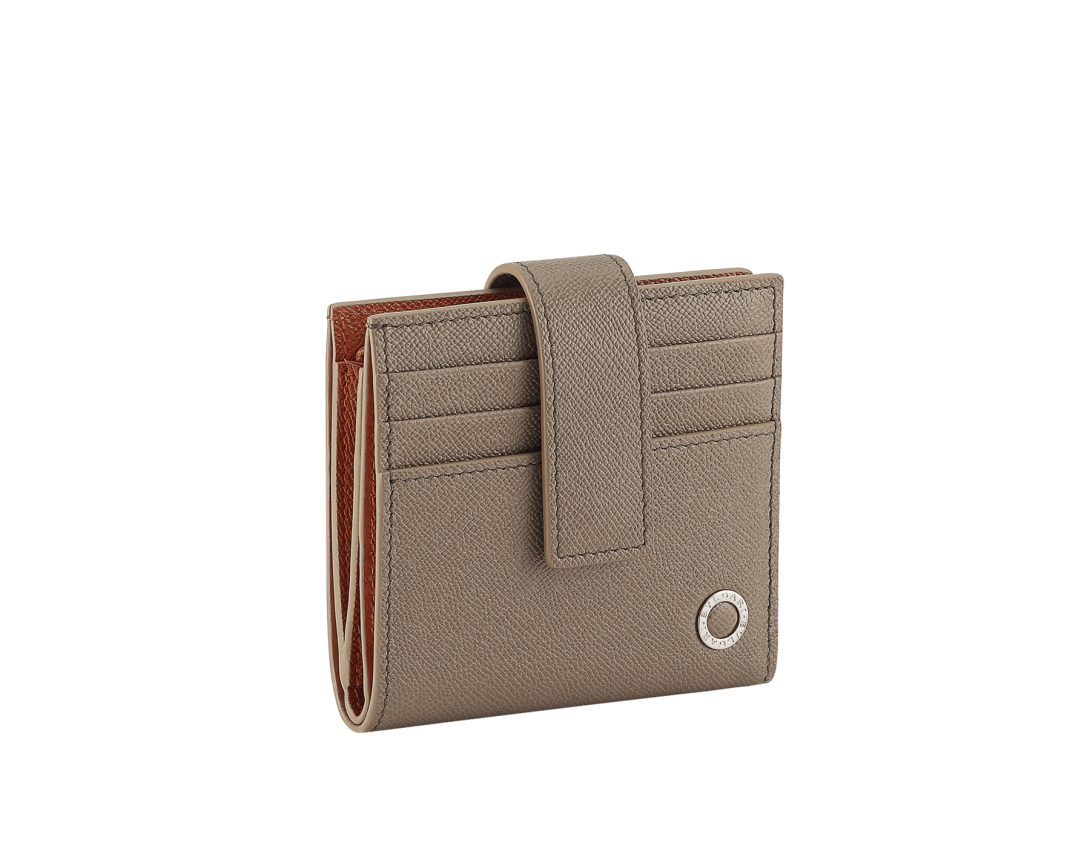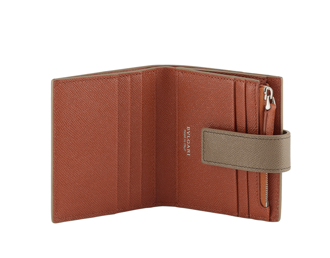 外側がムーンロック、内側がアンバーのグレインカーフレザーを使用したブルガリ・ブルガリ マン ジップコンパクトウォレット。アイコニックなBvlgariダブルロゴの装飾。プレスボタン付き二つ折りクロージャー。外側にジップ付きコインポケット×1、クレジットカードスロット6枚分。紙幣入れ×1。内側にもクレジットカードスロット6枚分。イタリア製。