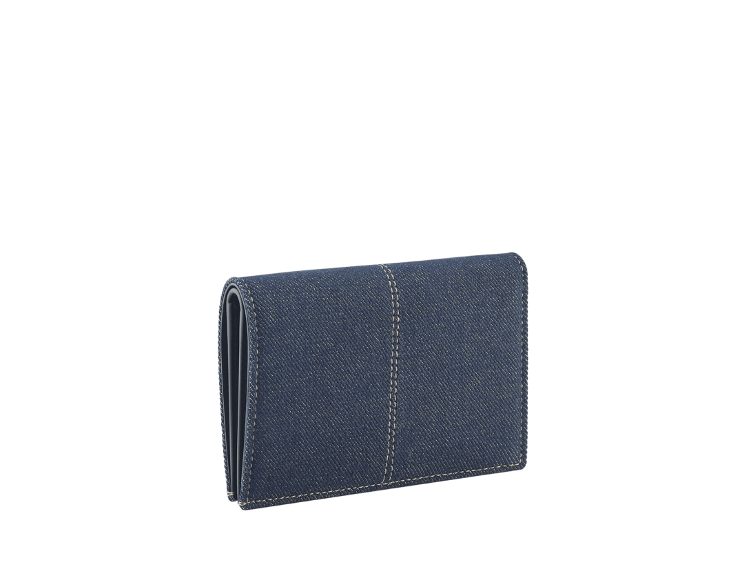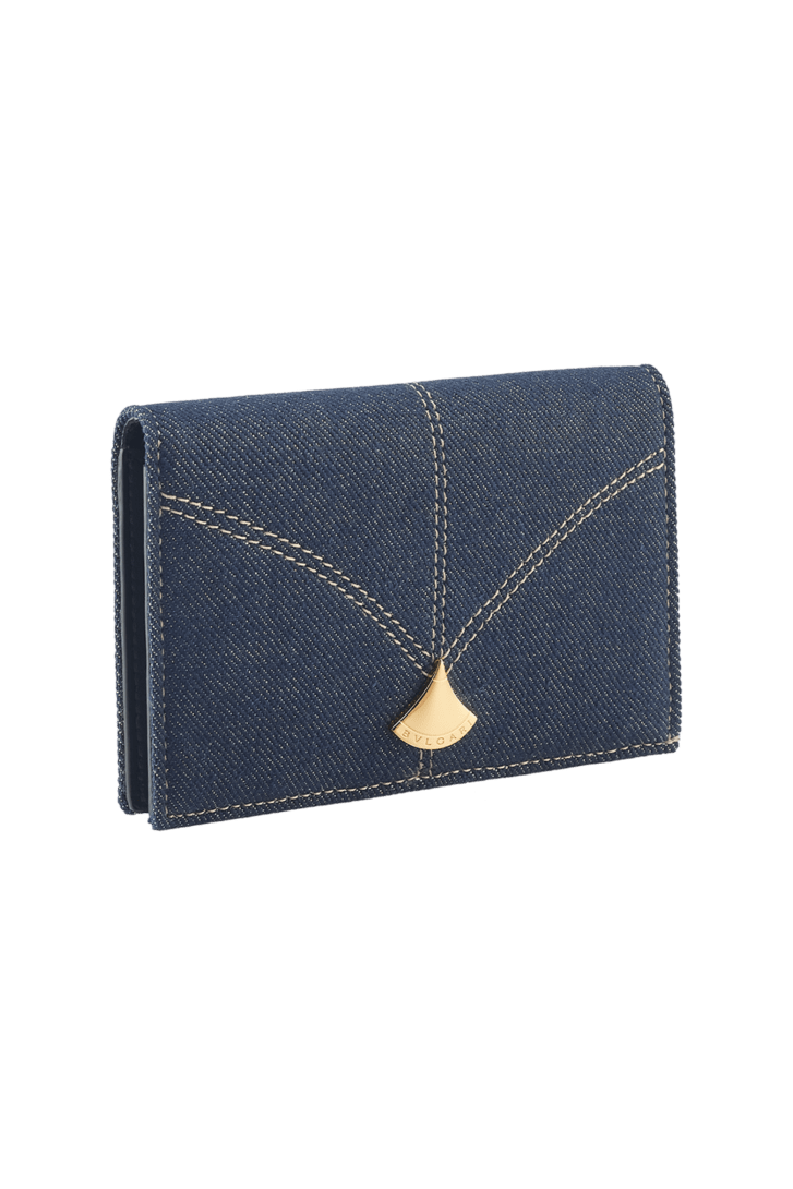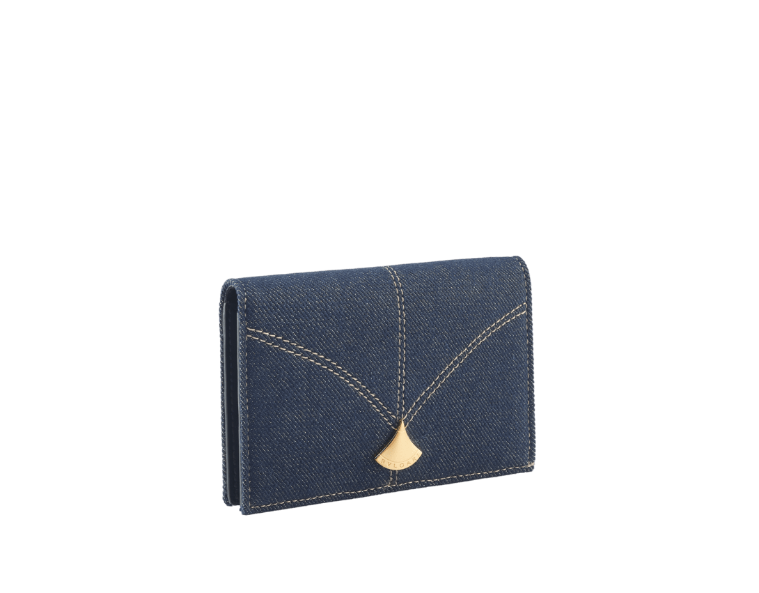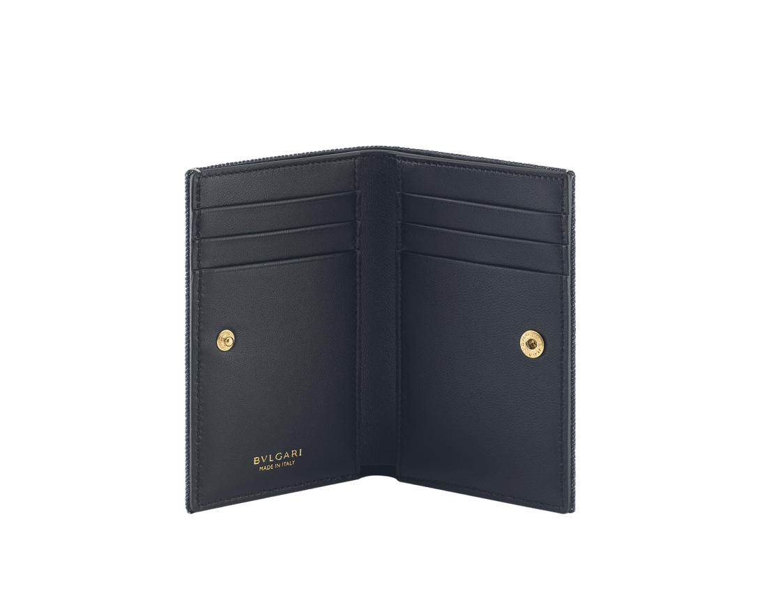 外側にはゴールドラメのディテールが煌めくサファイアデニム、内側にはブラックのナッパレザーを用いた、ディーヴァ ドリーム 二つ折りカードホルダー。ブルガリのジュエラーとしてのDNAとローマの文化遺産にインスパイアされたコレクションの美的シグネチャーが特徴です。メタリックな扇型のディーヴァ ドリーム モチーフをあしらった、気品漂うデザイン。紙幣入れ×1。内側にフラットポケット×2 。クレジットカードスロット6枚分。イタリア製。