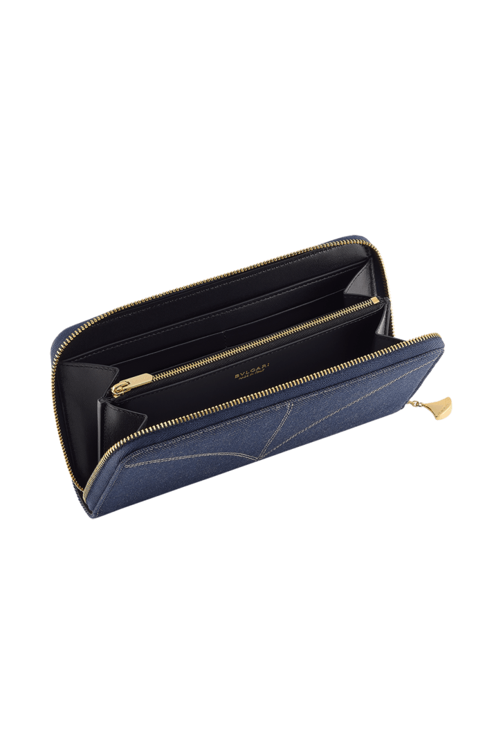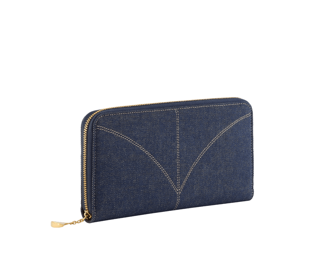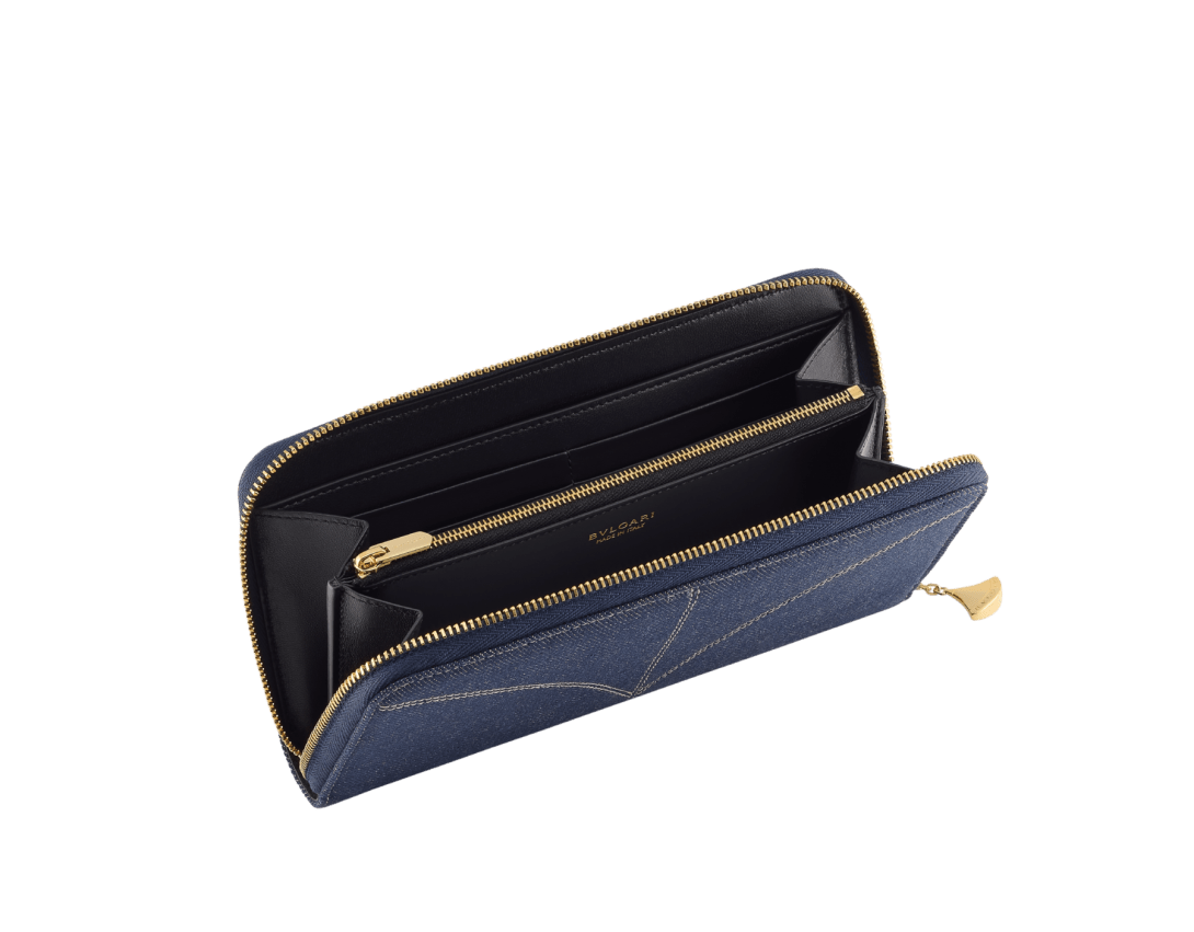 外側にはゴールドラメのディテールが煌めくサファイアデニム、内側にはブラックのナッパレザーを用いた、ディーヴァ ドリーム ラージウォレット。ブルガリのジュエラーとしてのDNAとローマの文化遺産にインスパイアされたコレクションを象徴する扇型の美的シグネチャーに彩られています。ジップアラウンドクロージャーをあしらった、気品漂う洗練されたデザイン。ディーヴァ ドリームのメタリックチャーム×1。内側に仕切りとジップ付きポケット×1。紙幣入れ×2。フラットポケット×2。クレジットカードスロット8枚分。イタリア製。