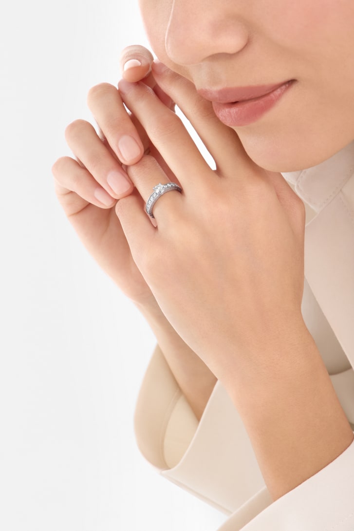 デディカータ・ア・ヴェネチア。ラウンド・ブリリアントカット・ダイヤモンドとパヴェダイヤモンドを使用し、ロゴをエングレーヴィングしたプラチナ製の「1503」ソリテール・リング。0.3ctと0.5ctのものがございます。 ヴェニスで最初にエンゲージ・リングの交換が行われた年にちなんで名づけられたライン。