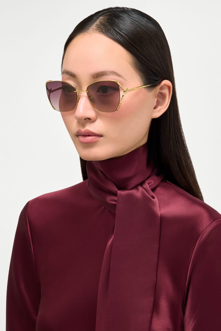 セルペンティ ヴァイパー サングラス。レクタンギュラーシェイプのメタル製フレーム。バイオレットのレンズ。テンプルにはアイコニックなセルペンティ ジュエリーに着想を得た絡み合ううろこ装飾が施され、スタイルに個性とフェミニンなタッチを添えています。