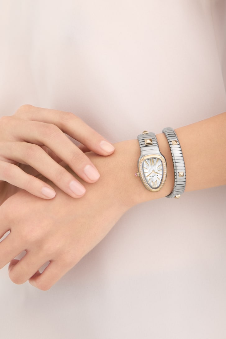 세르펜티 투보가스 스터드 캡슐 1줄 워치. 스테인리스 스틸 소재, 다이아몬드가 세팅된 18kt 옐로 골드 소재의 베젤, 18kt 옐로 골드 소재의 스터드가 장식된 브레이슬릿, 마더오브펄 다이얼. 최대 30미터 방수 기능.