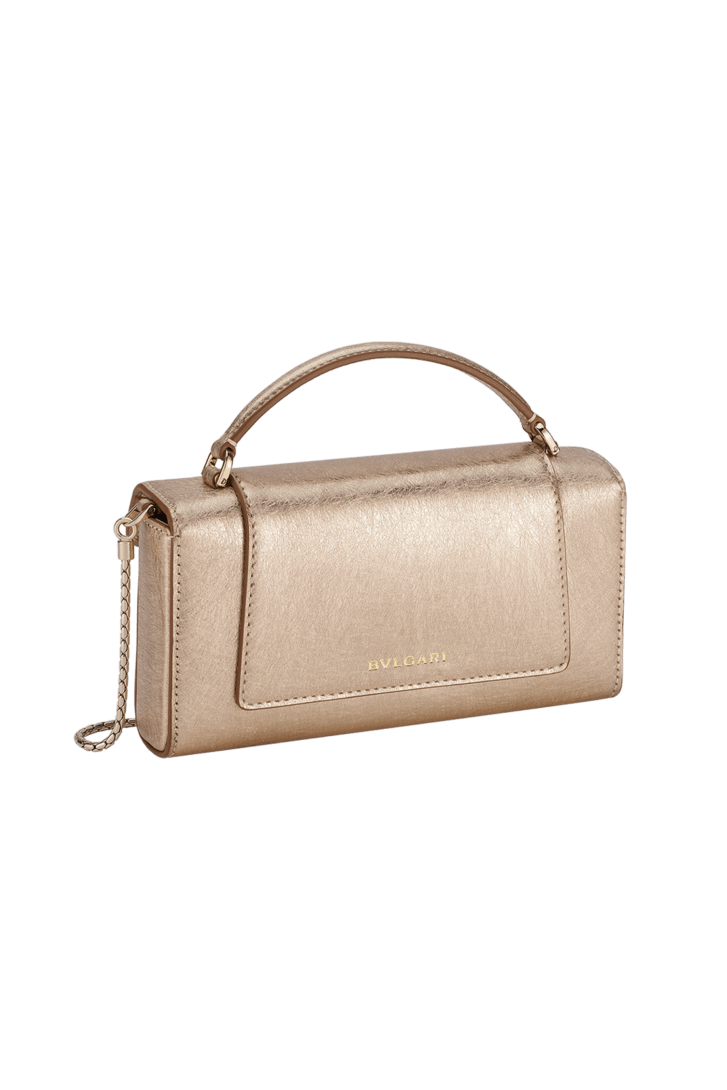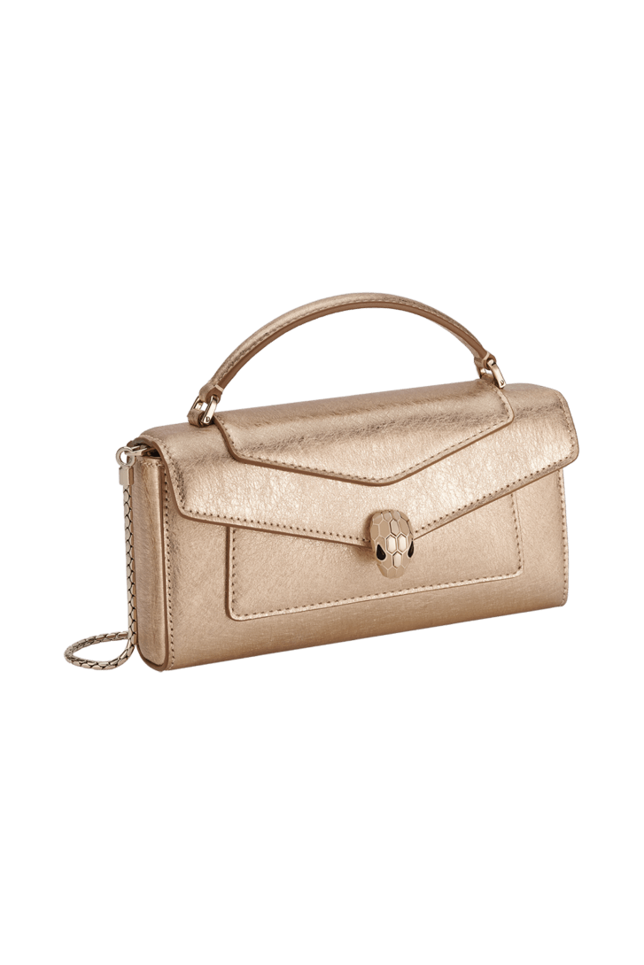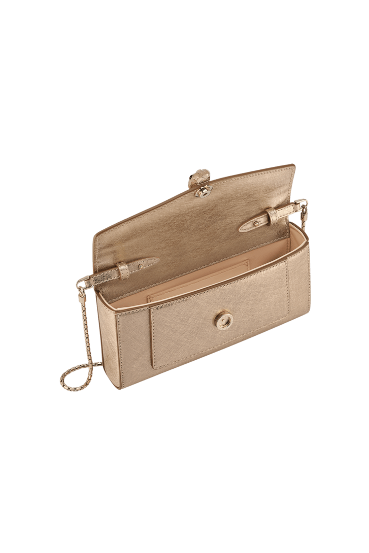 Serpenti Forever 휴대폰 케이스. 라이트 골드 컬러의 줄무늬 카프 레더 소재, 리넨 아게이트 컬러의 나파 레더 안감. 모던하고 도시적인 감성을 자아내는 기능적인 디자인. 성별에 구애받지 않고 착용할 수 있는 실용적인 스타일. 1960년대의 Serpenti 주얼리에서 영감을 받은 매혹적인 컬러의 비늘과 디자인이 돋보이는 아이코닉 헤드 자석 잠금장치. 수납칸 1개, 탑 핸들, 체인 스트랩, 카드 슬롯 1개. 19 x 10 x 3.5cm. Made in Italy.