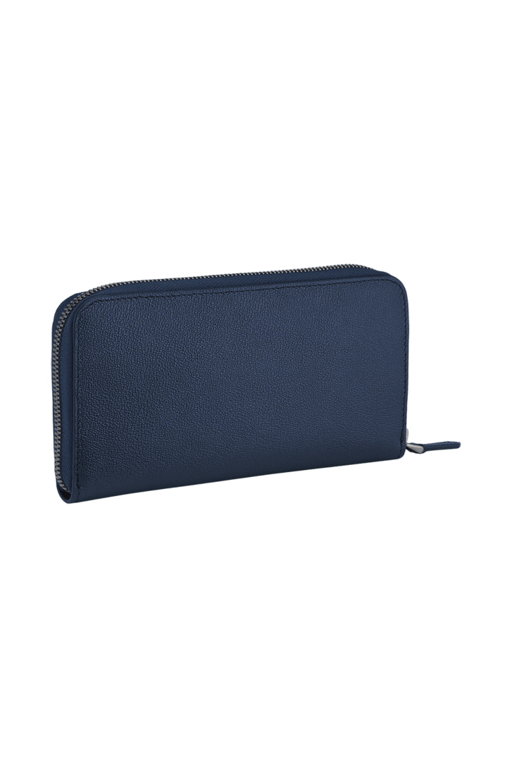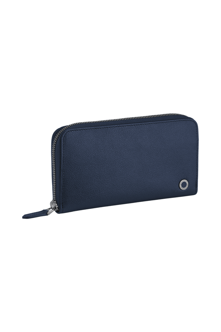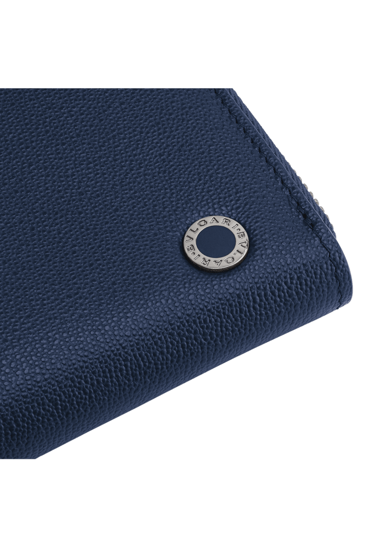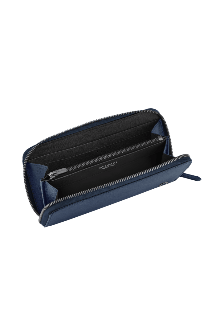 Carteira grande com zíper Bvlgari Bvlgari Man em couro de novilho granulado Urban azul-marinho no exterior e preto no interior. Icônico adorno em metal banhado a rutênio escuro com esmalte azul-marinho fosco e com fecho com zíper.