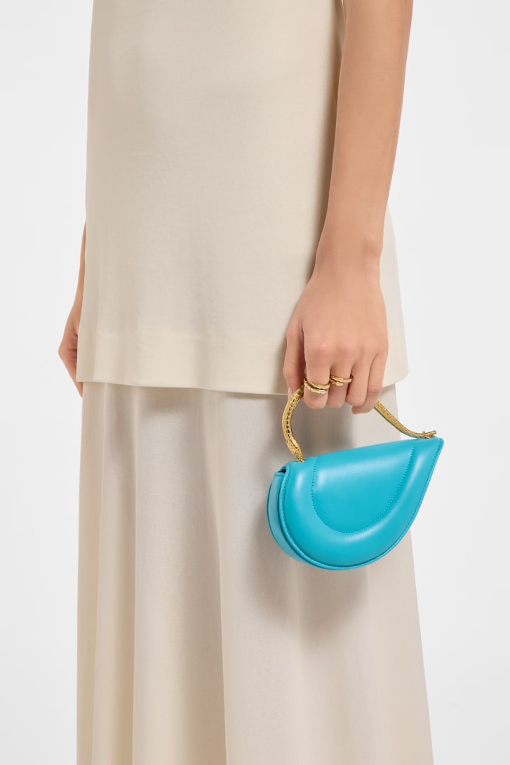 Bolsa de mão Serpenti Cuoricino modelo míni em couro de novilho Feroza Turquoise com forro em couro napa Feroza Turquoise. Fascinante alça de mão em forma de corpo de serpente em metal banhado a ouro adornada com escamas gravadas; fecho de botão de pressão.