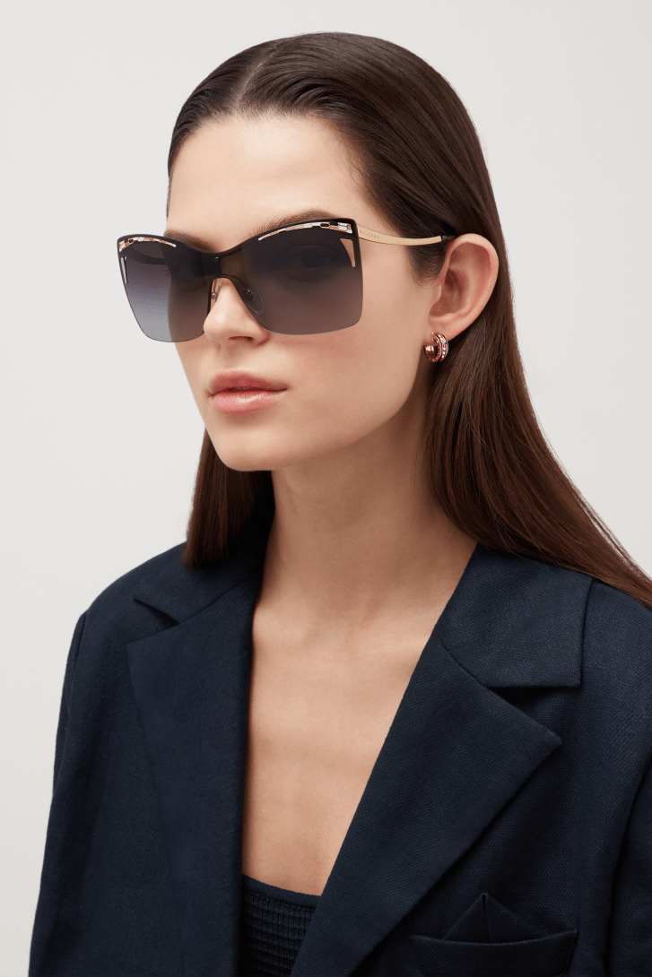 Os óculos de sol Bvlgari Serpenti “Eye-bite” estilo shield traz decoração multicolorida esmaltada na linha da sobrancelha e um detalhe vazado dando vida às lentes degradês cinza combinadas com hastes sinuosas na cor ouro rosa. O modelo combina a beleza perigosa das preciosas escamas com o movimento sedutor da serpente.