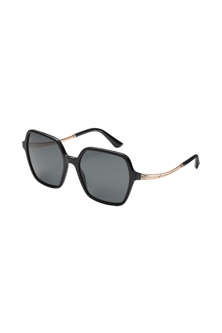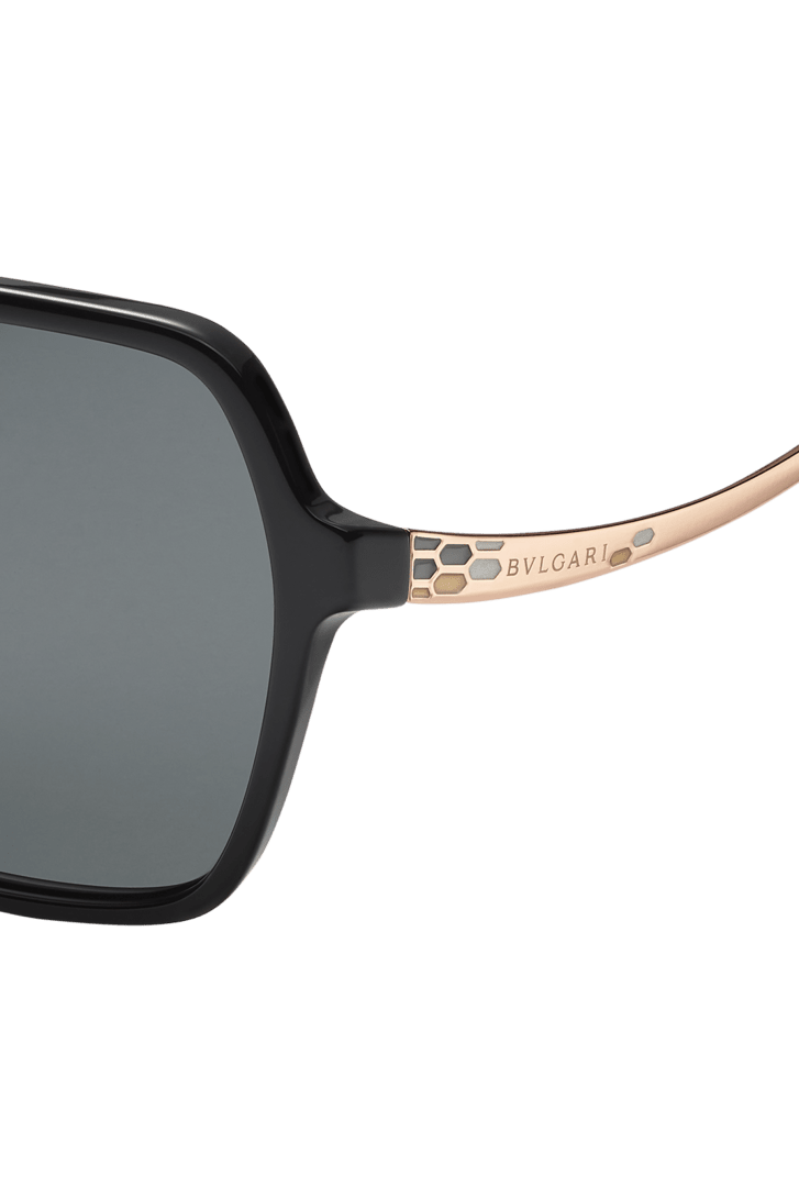 Óculos de sol Serpenti "Colourhapsody" com armação hexagonal em acetato preto e lentes totalmente pretas. O modelo é enriquecido com um padrão de microescamas em esmalte nas hastes, evocando um efeito caleidoscópio.