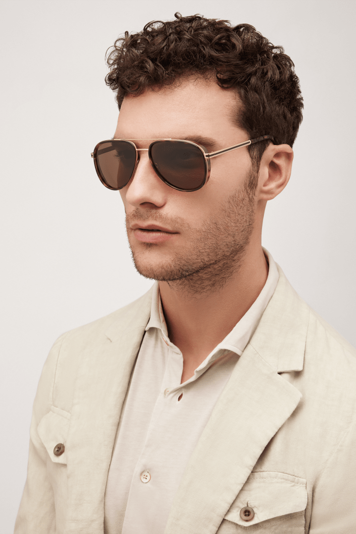 Óculos de sol masculinos Bvlgari Bvlgari apresentando uma ponte dupla elegante e esportiva, armação formato aviador com spoiler de acetato, lentes marrons e hastes gráficas com inserções em esmalte.