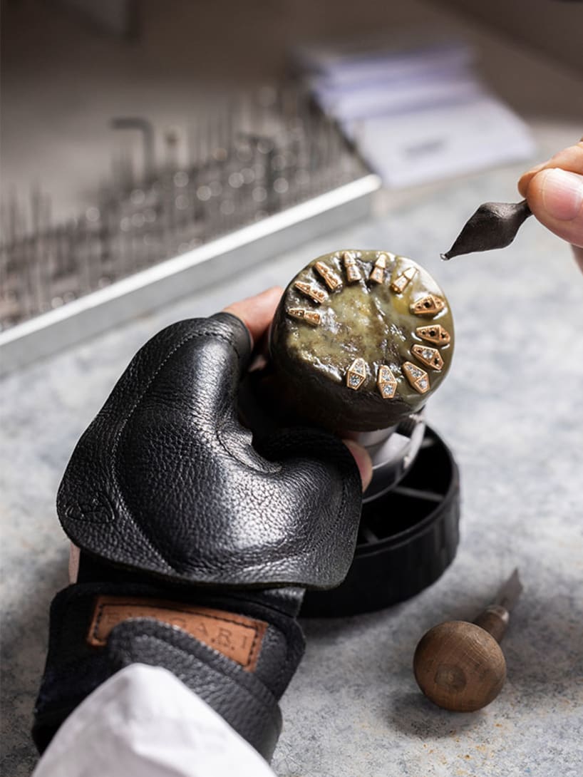 Na Manifattura Bvlgari, as criações ganham vida nas mãos experientes dos artesãos, perfeitamente complementadas por maquinário inovador em um diálogo contínuo entre tradição e inovação. Localizada em um oásis verde e tranquilo, esta fábrica é, acima de tudo, um tributo ao fator humano, a verdadeira força propulsora e a inspiração por trás dela.