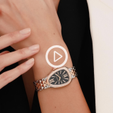 Serpenti Seduttori 腕錶採用 18K 玫瑰金與精鋼材質,結合感性、神祕與現代魅力,令時間倍顯珍貴。搭載自動上鍊機械機芯,黑色漆面錶盤鑲嵌於經典水滴形錶殼之中,錶圈鑲飾鑽石,綻放精緻璀璨的光彩。錶鍊的設計靈感源自蛇鱗,以繁複的六角形結構製作而成,柔軟服貼,象徵珠寶工藝與製錶技術的完美邂逅。