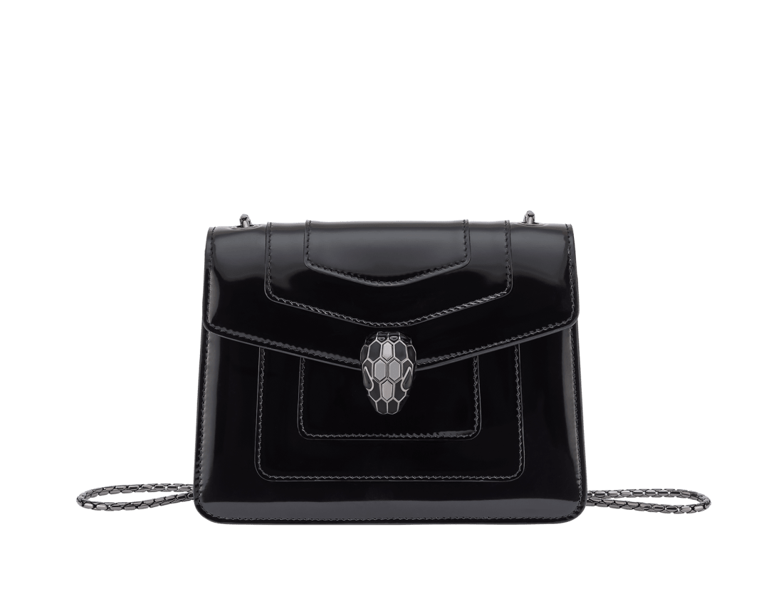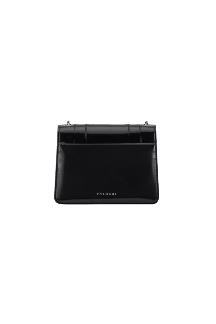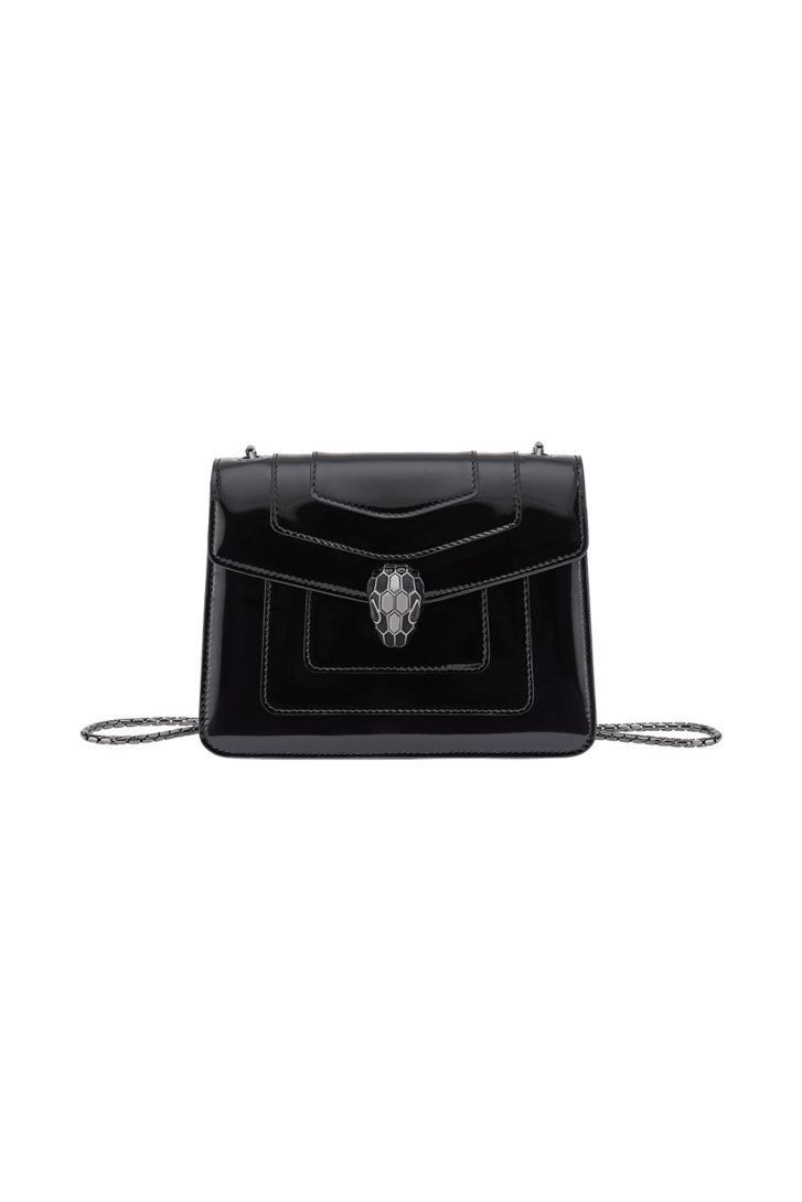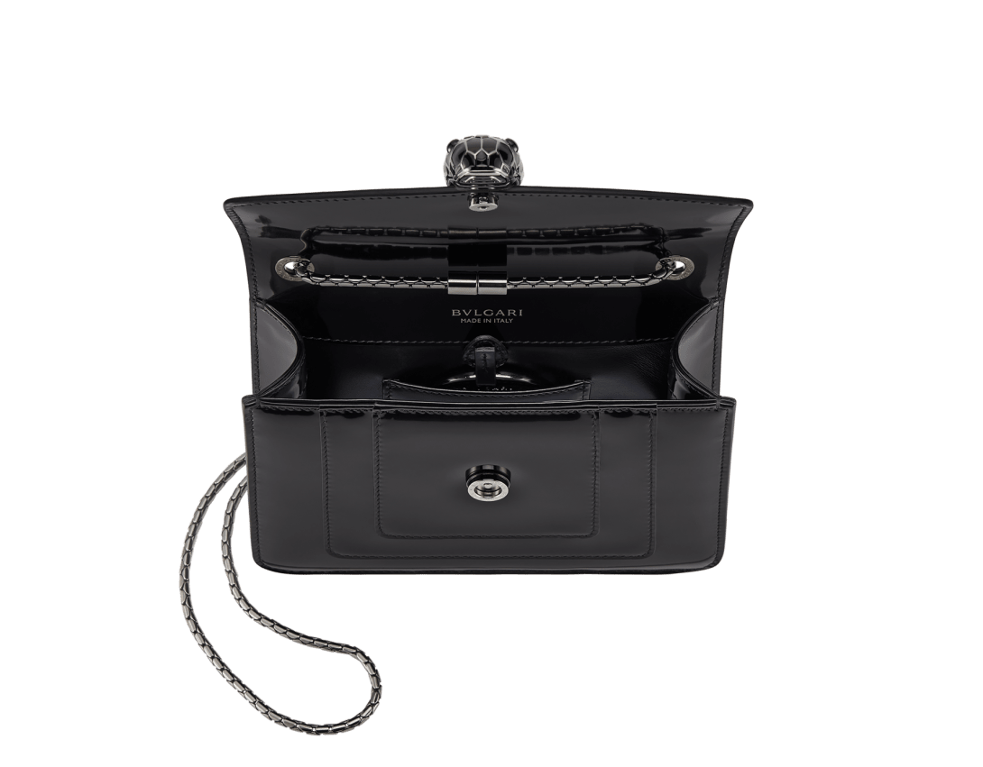 Serpenti Forever系列小号斜挎包,采用黑色光泽磨砂小牛皮材质,打造现代且均匀亮泽的效果,以精致色调重新演绎隽永魅力。作品搭配蛇形链条肩带,饰以标志性蛇首磁扣,其魅惑迷人的鳞片与设计从1960年代的Serpenti系列珠宝中汲取灵感。设有一个单隔层,一个背面拼接口袋,一个配可个性化定制化妆镜的内部镜袋,背面饰Bvlgari宝格丽金属标识。20 x 15 x 5 厘米 - 7.9 x 5.9 x 1.8 英寸。意大利制造。