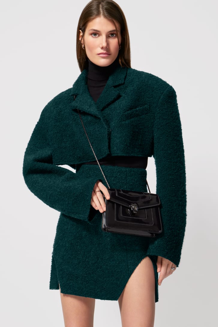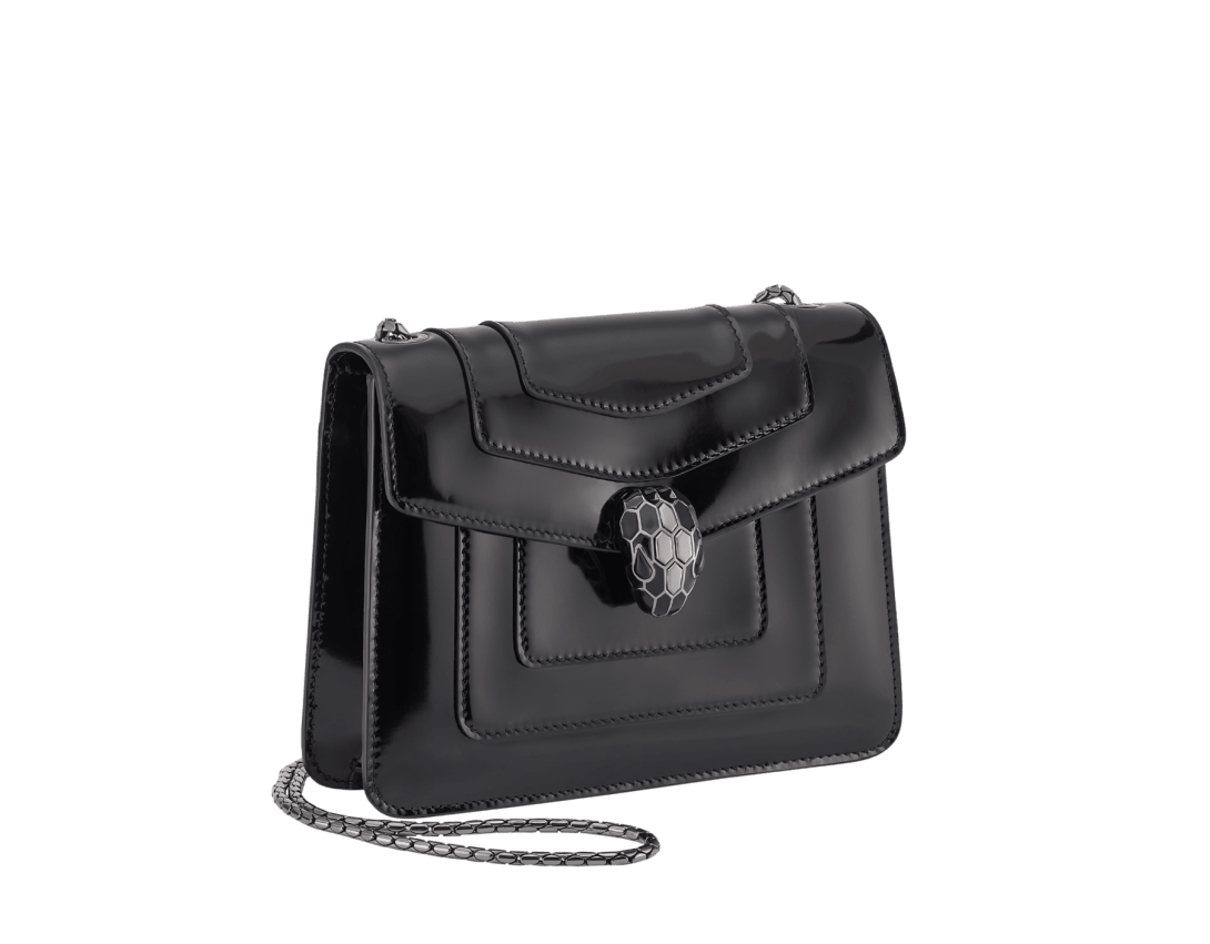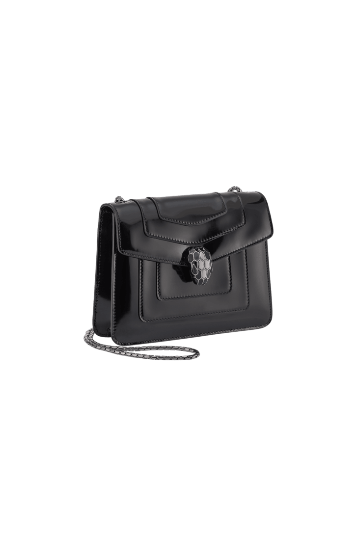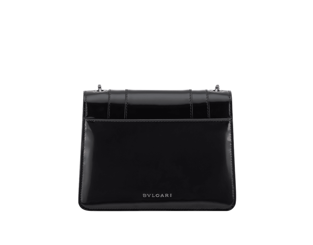 Serpenti Forever系列小号斜挎包,采用黑色光泽磨砂小牛皮材质,打造现代且均匀亮泽的效果,以精致色调重新演绎隽永魅力。作品搭配蛇形链条肩带,饰以标志性蛇首磁扣,其魅惑迷人的鳞片与设计从1960年代的Serpenti系列珠宝中汲取灵感。设有一个单隔层,一个背面拼接口袋,一个配可个性化定制化妆镜的内部镜袋,背面饰Bvlgari宝格丽金属标识。20 x 15 x 5 厘米 - 7.9 x 5.9 x 1.8 英寸。意大利制造。