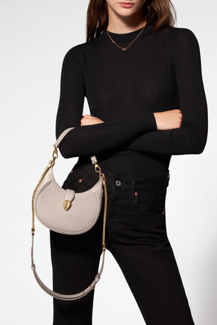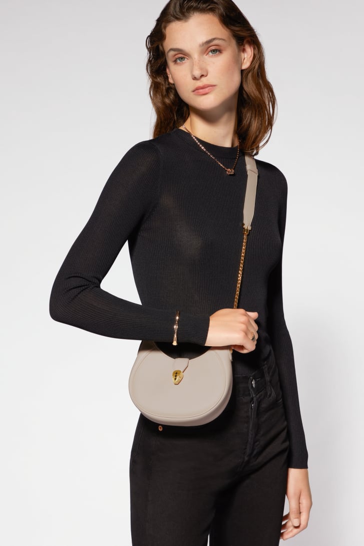 Serpenti Ellipse系列月光珍珠浅灰色都市粒纹小牛皮小号斜挎包,搭配艳彩碧玺紫红色罗缎衬里。迷人的镀金黄铜蛇首磁扣,饰以黑色缟玛瑙鳞片,点缀红色珐琅双眼,附加顶部拉链开合设计。