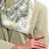 Polychroma Shine 絲巾,採用上等自然色斜紋絲,飾以 BVLGARI BVLGARI 金屬吊墜,大膽而多層次的設計讚頌色彩的豐富無限。詮釋切割寶石的光彩,環繞著「維納斯之鏡」,這是映照之美的古老象徵,同時呼應神話傳承與寶格麗超越時間的品牌象徵。體現品牌無與倫比的精湛工藝,採用雙面印刷工藝,呈現三十多種色彩,並於正反兩面以手工飾以金箔,增添獨特奢華質感。配戴方式十分多樣,可繫在脖子上呈現經典造型,以時尚手法綁在頭髮上,或綁在包包上展現個人風格。90 x 90 公分 - 35.4 x 35.4 吋。100% 純絲。義大利純手工製作。